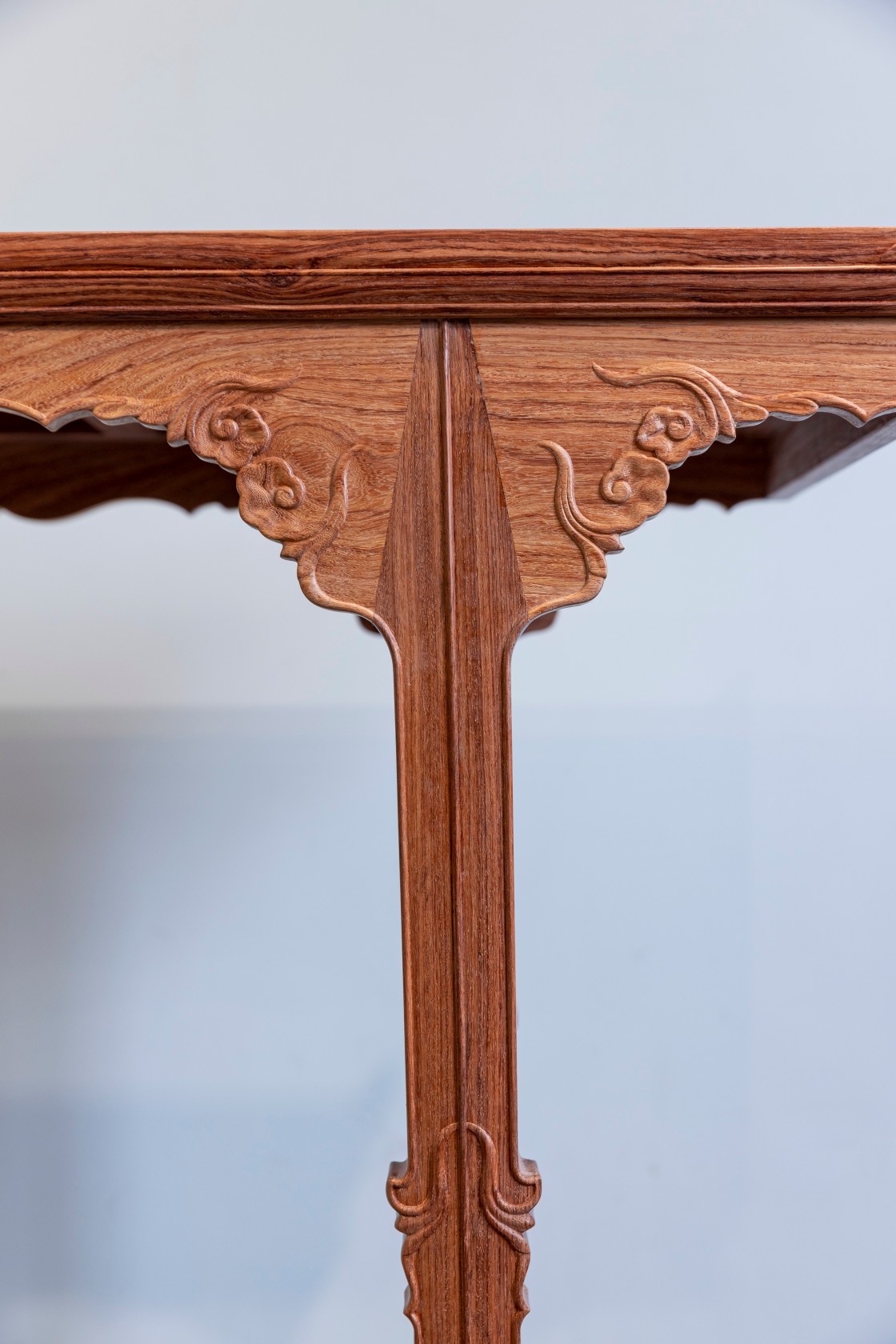 四足青锋倒竖,双翻马蹄落于莲式托子,阶梯式接地。正中贯通一根凸起线条,高而细,装饰如剑脊,插肩问天,匠心袭古。腿足两侧安梯子枨,方材做大弧面,介于椭圆与指甲圆之间。
