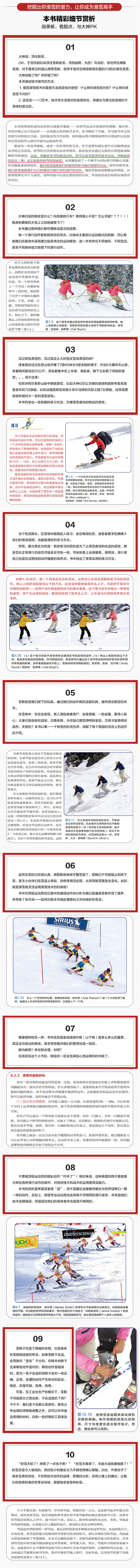《滑雪宝典》是一部全面的滑雪技术手册,系统讲述了如何理解滑雪、如何提高滑雪技术。全书分三篇,第一篇讲解了滑雪的基础知识,包括滑雪力学,雪板、雪和运动控制,转弯的解析,让你理解如何依靠雪的作用力来滑雪;第二篇讲解了滑雪的各种技术,包括对齐和站姿、前后的平衡和移动、上下移动、雪板转向、雪板用刃、侧向平衡以及雪鞋的选择和调校等,教你如何控制自己的身体、做出符合雪况的合理动作;第三篇详解了在冰面、蘑菇、粉雪、烂雪和雪泥以及陡坡等实际雪况中滑雪时的装备以及技战术选择。全书使用了很多世界顶级滑雪运动员的全彩色合成照片和三维图解,直观地展现了雪道与动作的情况,对你掌握动作要领非常有帮助。 本书可作为有一定经验的滑雪者技术进阶的学习用书,也可供广大滑雪爱好者入门时参考阅读。