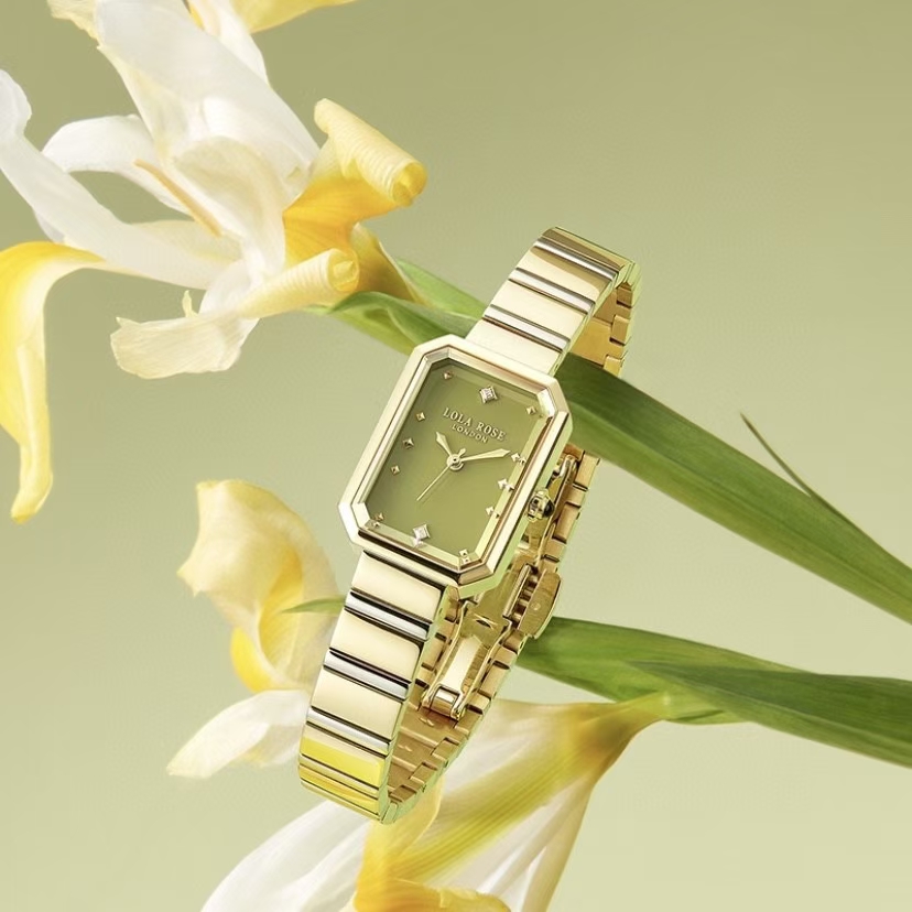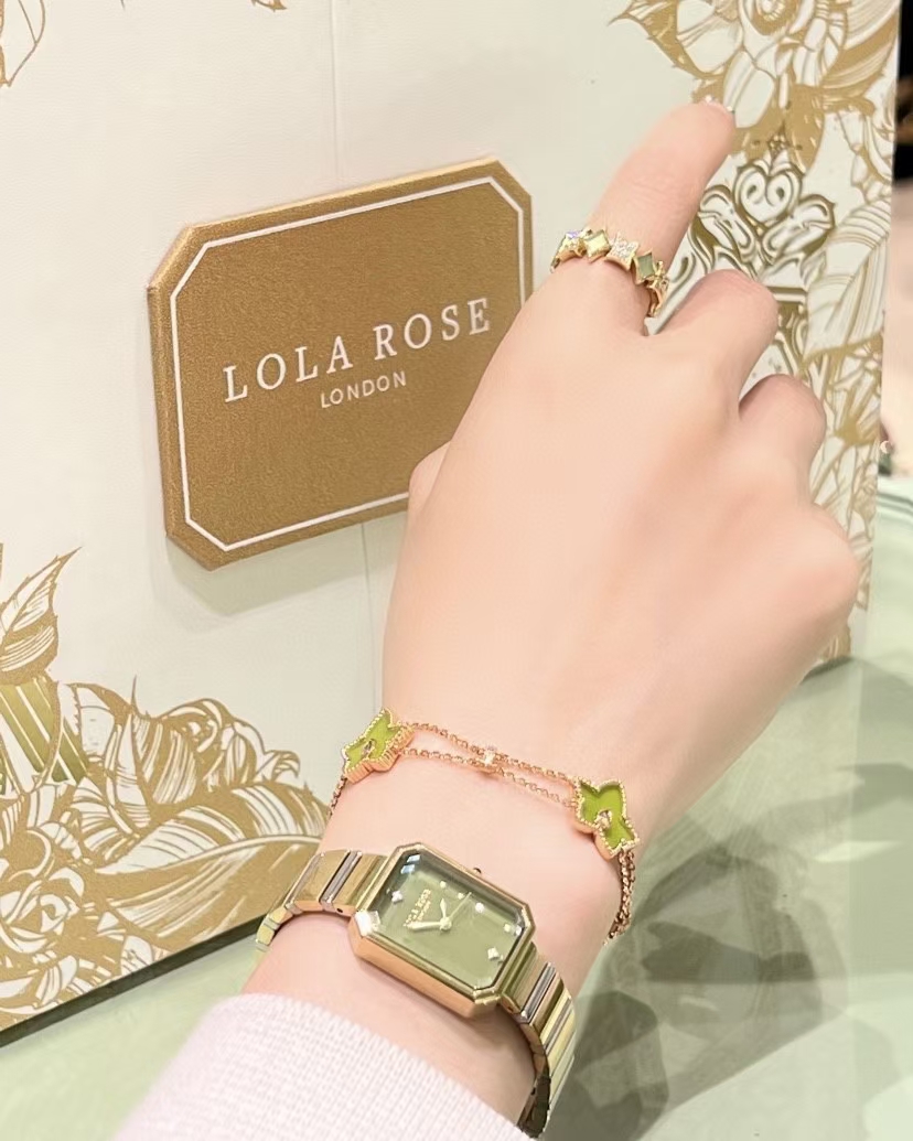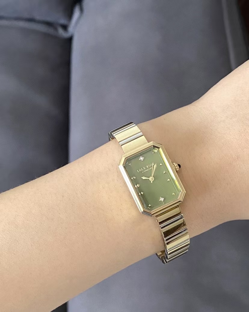 Lola Rose以全新面貌演绎品牌经典之作,设计师扑捉春日伊始的一抹嫩绿色泽,将绿玛瑙宝石的清新灵动融入表盘,搭配别致闪星刻度个金银间跃表带,宛如一颗经营方糖于腕间点缀活色彩与经典之上探索多面美好!