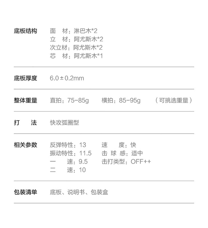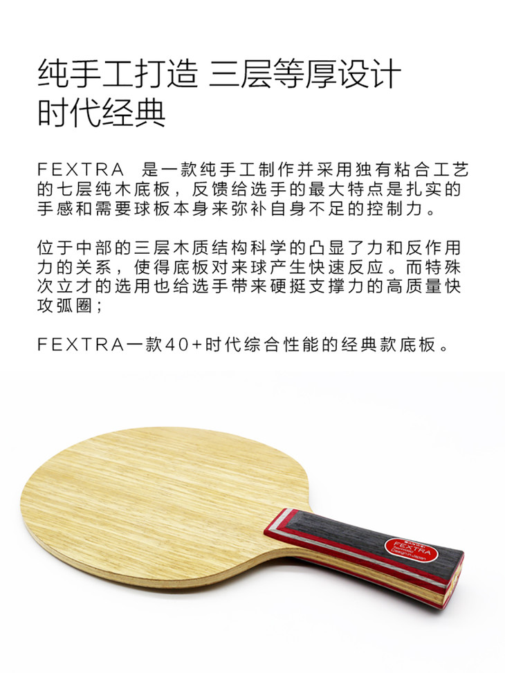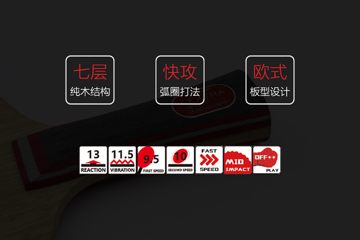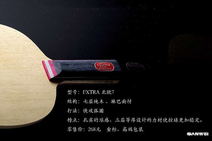 简介:“北欧 7” 是一款纯手工制作并采用独有粘合工艺的七层纯木底板,反馈给选手的最大特点是扎实的手感和需要球板本身来弥补自身不足的控制力。位于中部的三层木质结构科学的凸显了力和反作用力的关系,使得底板对来球产生快速反应;而特殊次力材的选用也给选手带来硬挺支撑力的高质量快攻弧圈。