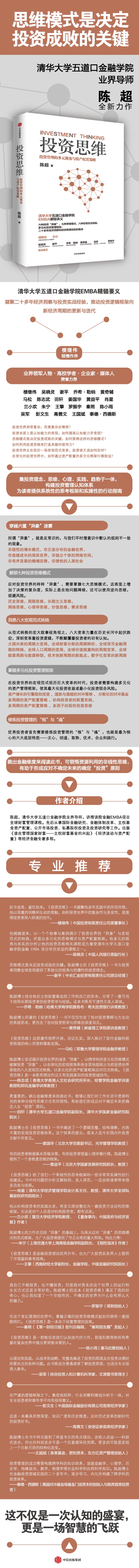 陈超博士所著的《投资思维》一书不仅仅包含了他对投资策略与方法论的系统思考,更包含了他对投资哲学与思维的深度洞见。