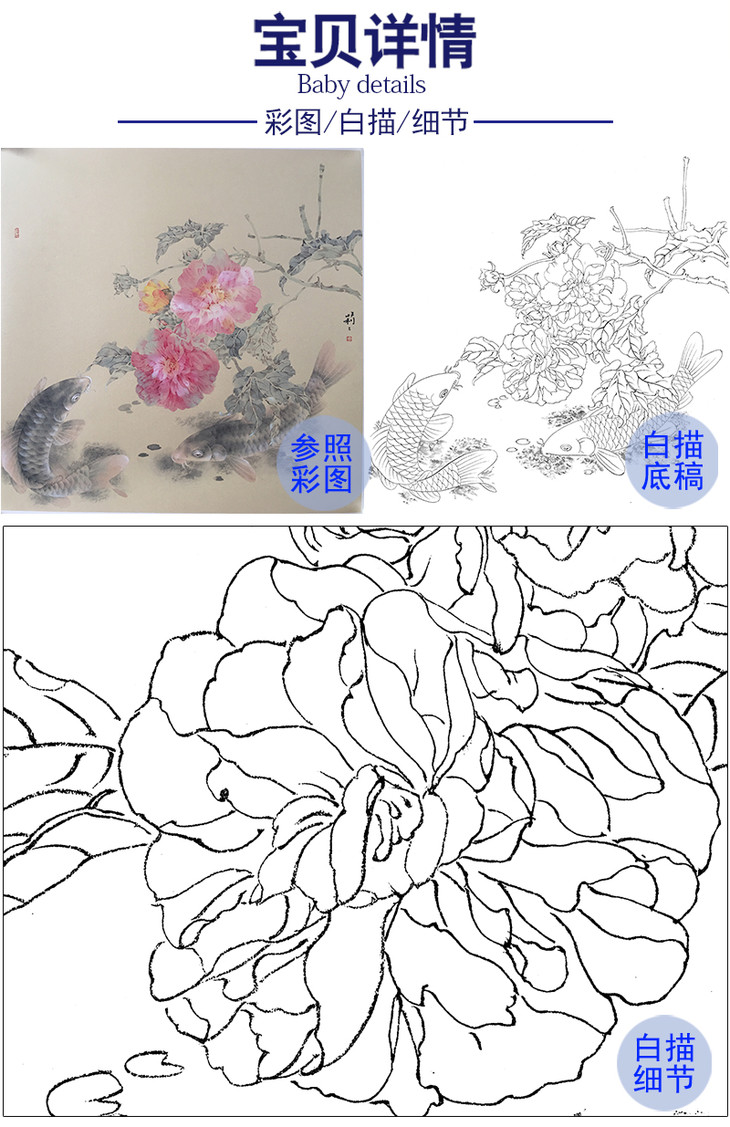 工笔花鸟白描底稿-周中耀牡丹小品《二乔》-多种白描尺寸可选-ZY04