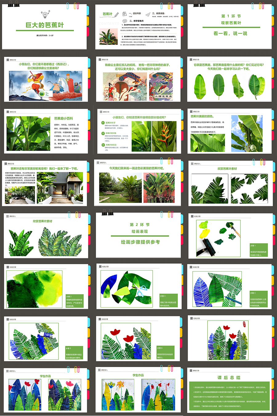 通过对芭蕉叶外形以及细节的深入观察,用剪贴的方式表现出芭蕉叶的外形,注意叶子的大小变化,通过了解芭蕉叶的生长规律,微信公众号创意少儿美术馆感受线条排列组合产生的结构感,细心的处理叶脉的线条,提高小朋友们的观察能力与线条的表现能力。
