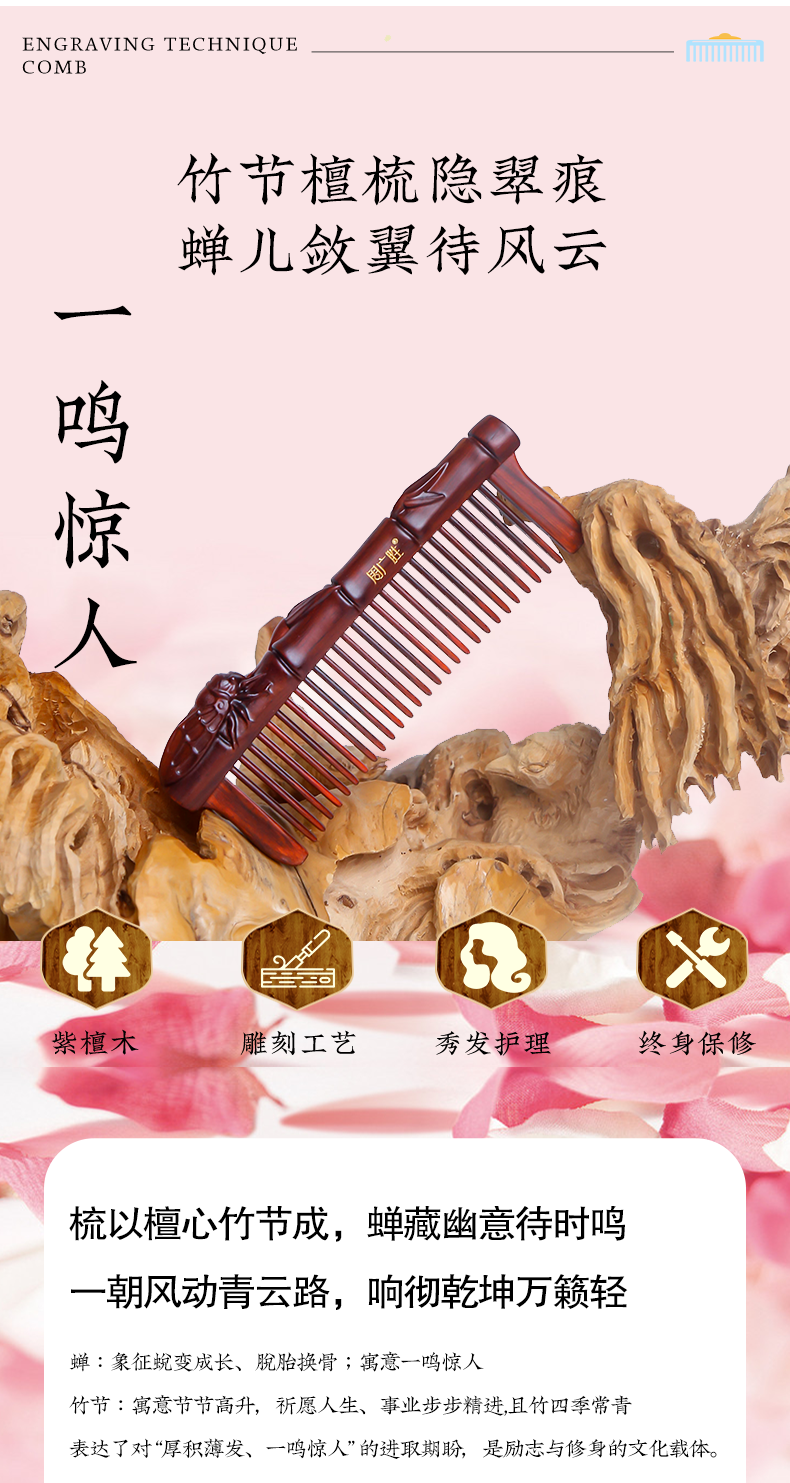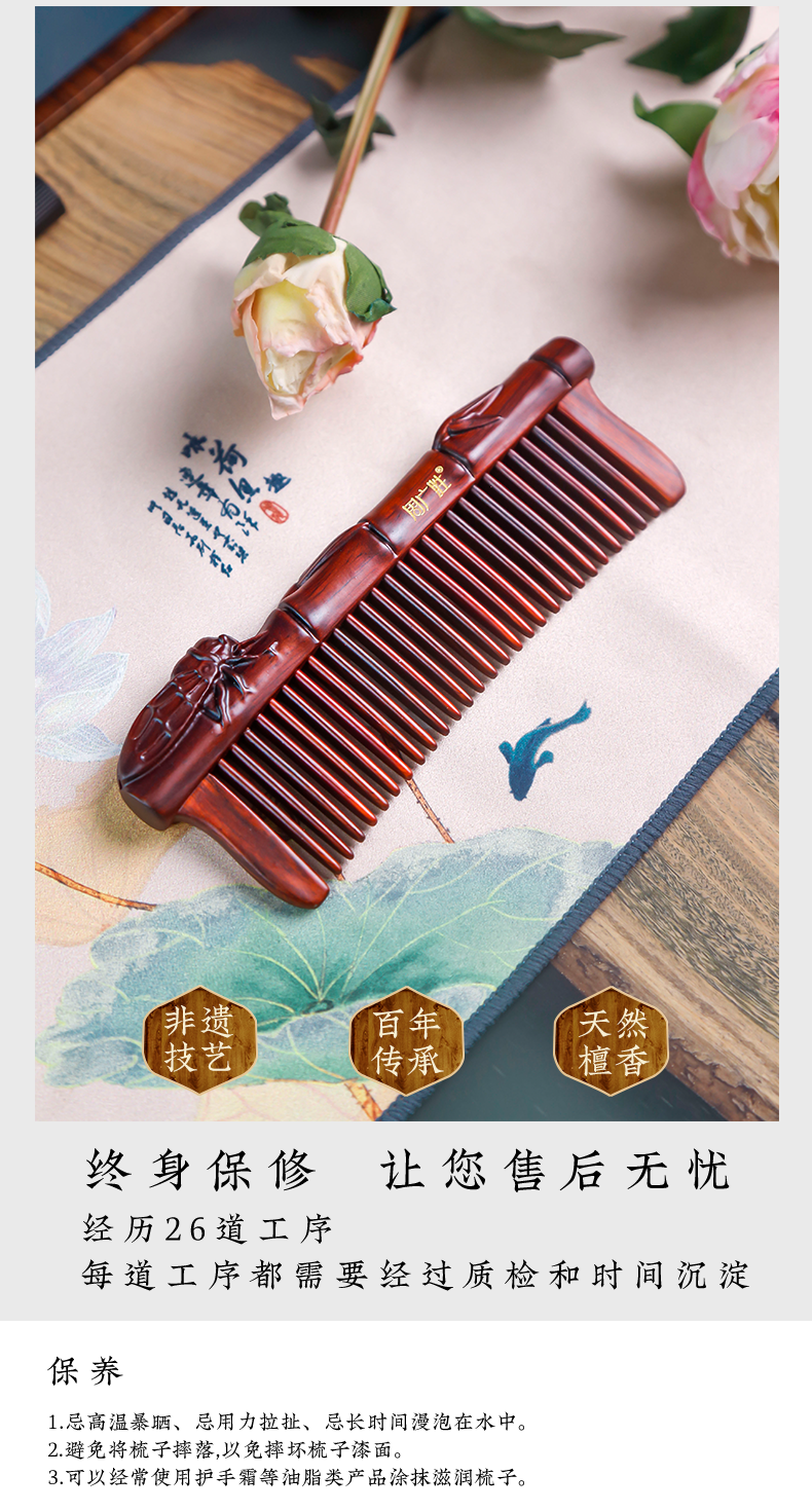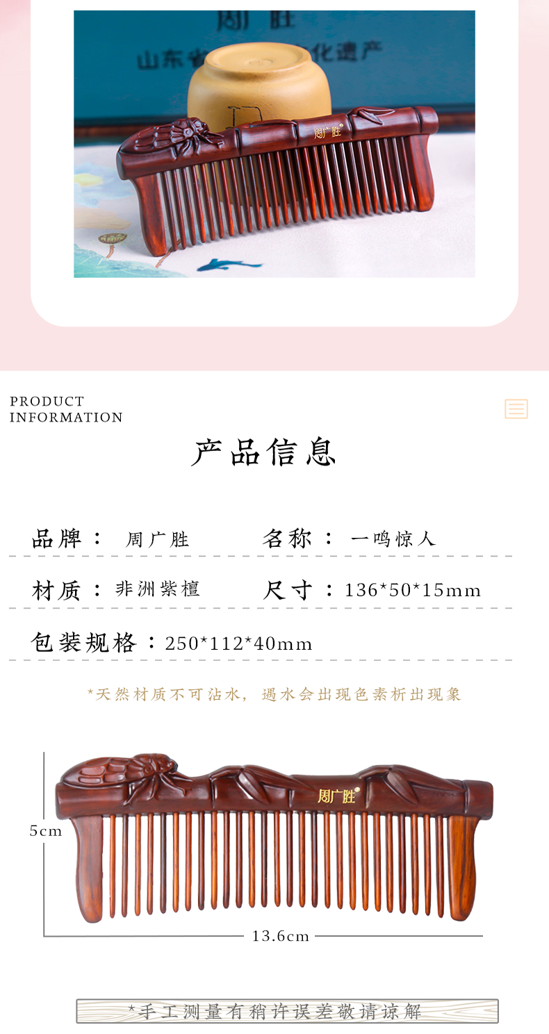 周广胜天然紫檀木镶齿一鸣惊人雕花木梳蓬松护发头部按摩