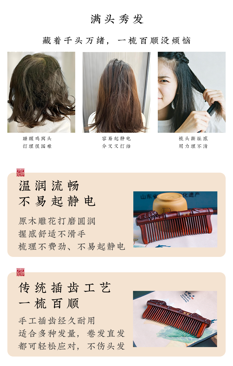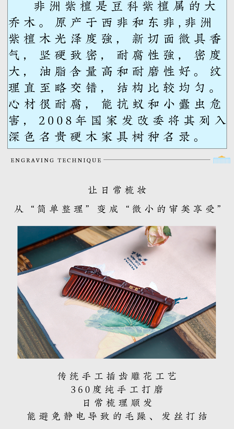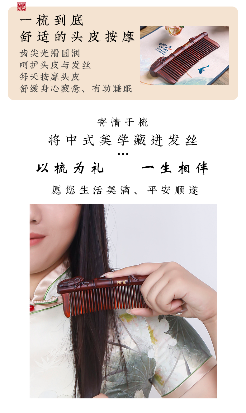 周广胜天然紫檀木镶齿一鸣惊人雕花木梳蓬松护发头部按摩