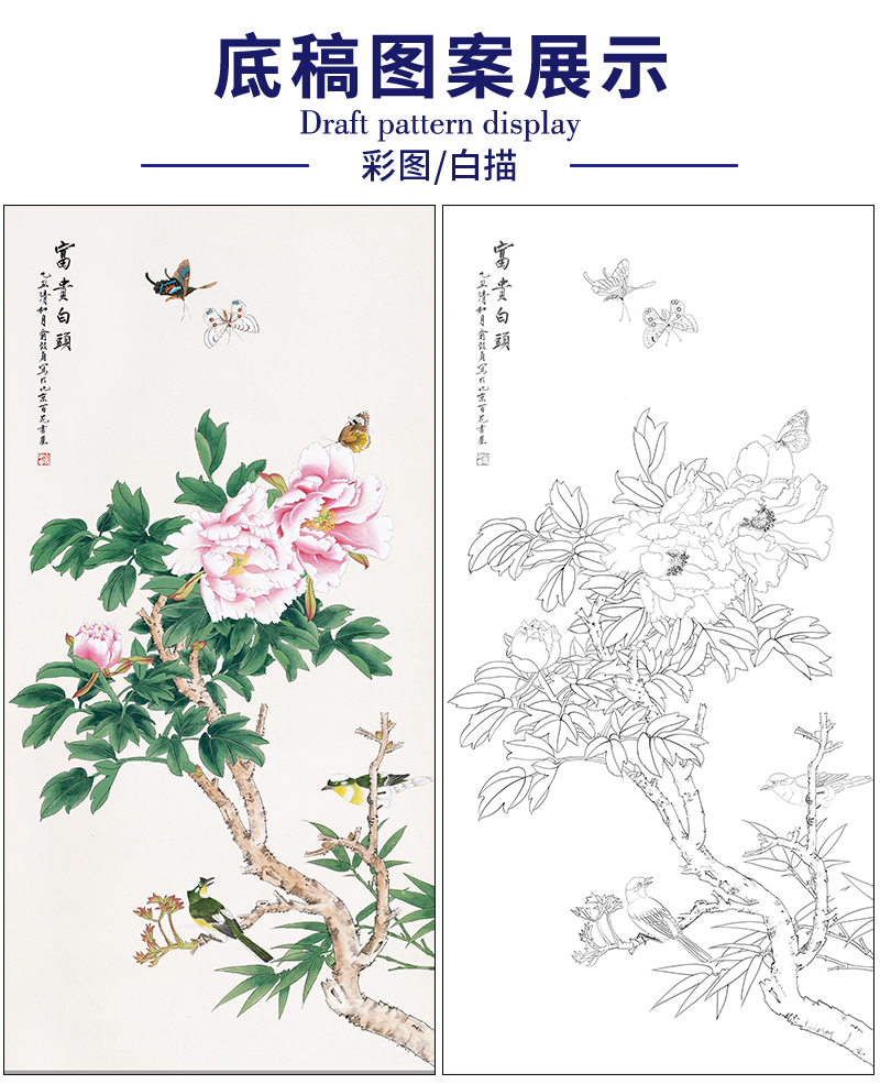 俞致贞花鸟牡丹工笔画白描底稿《富贵白头》临摹勾线高清打印稿ZZ45