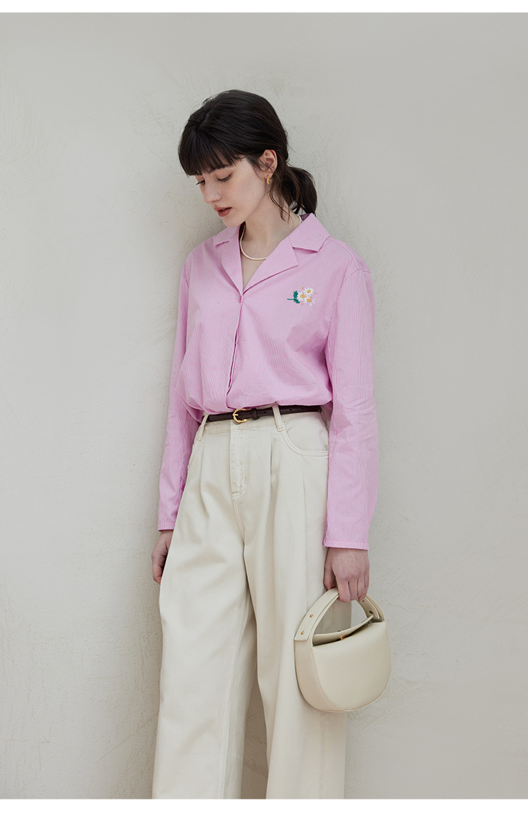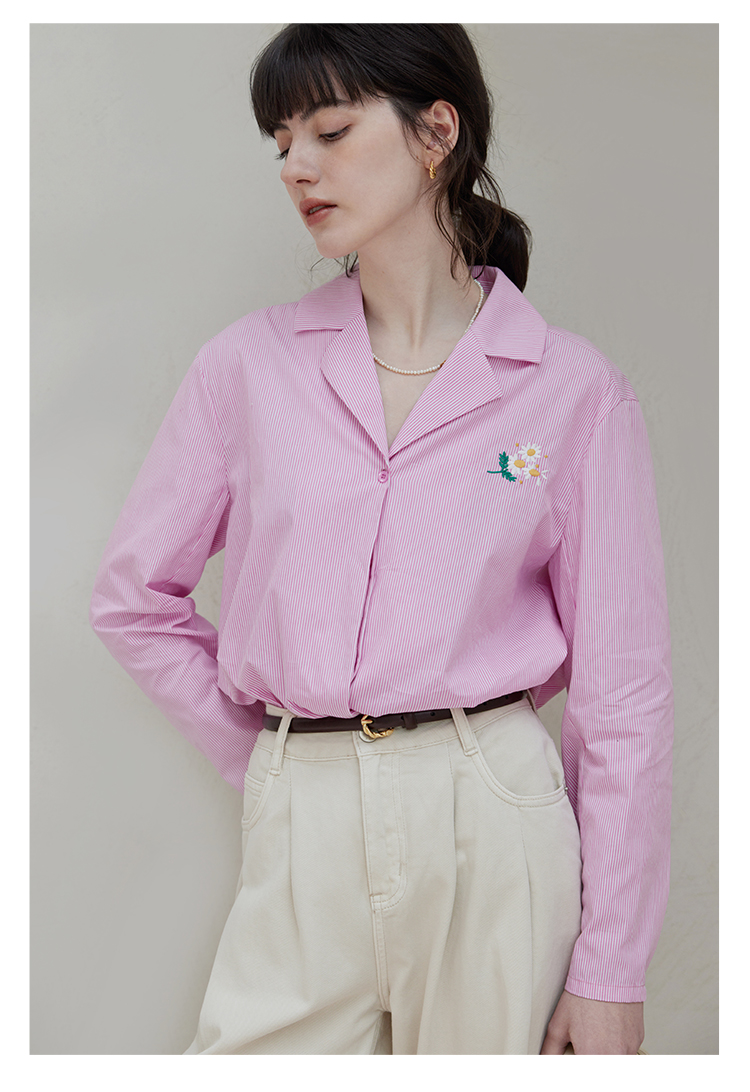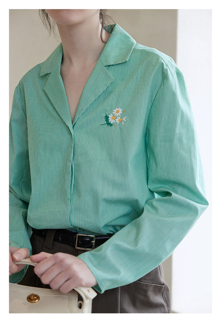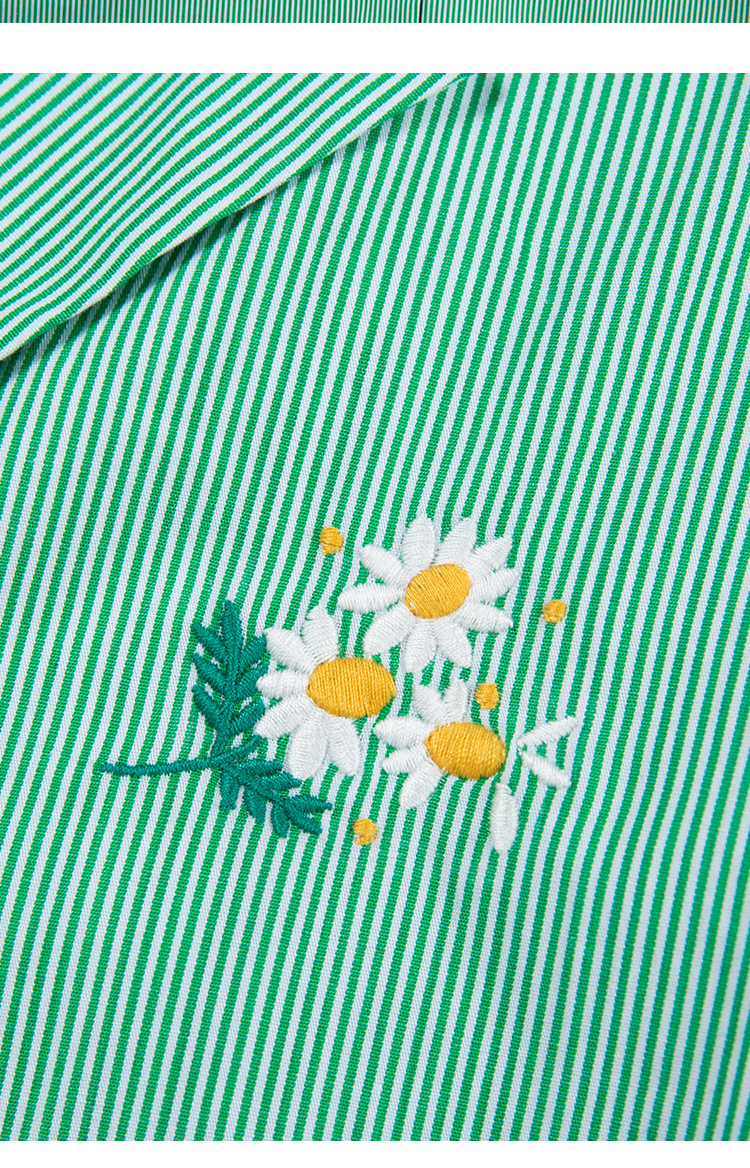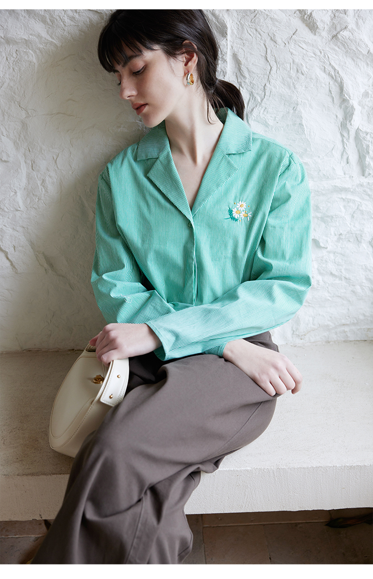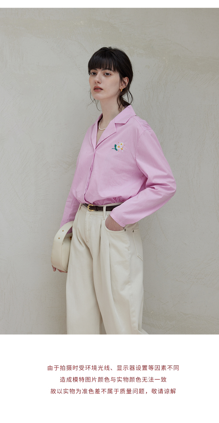 【周四精选福利】HeyDress条纹刺绣衬衣女法式复古V领小雏菊设计衬衣别致上衣