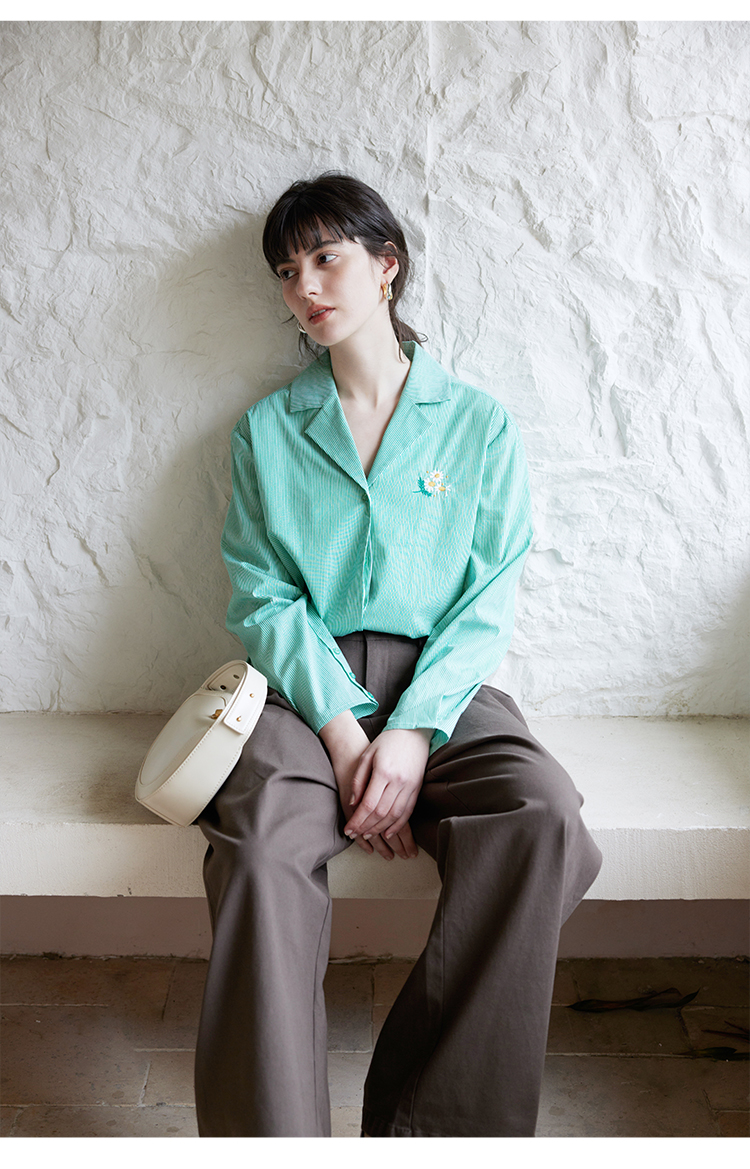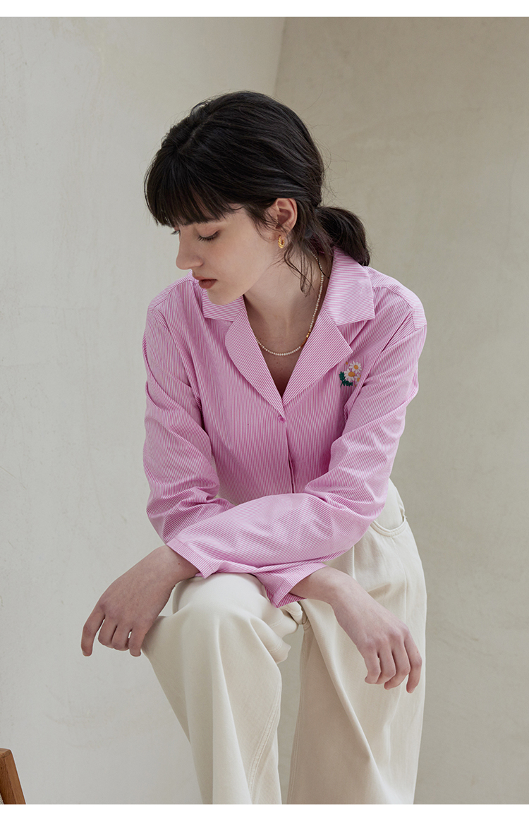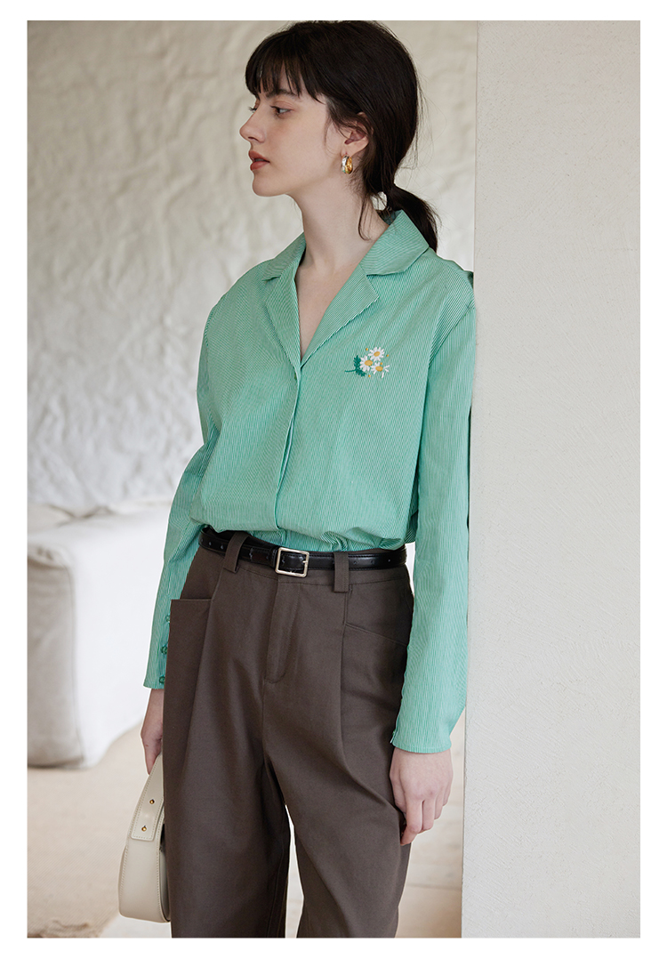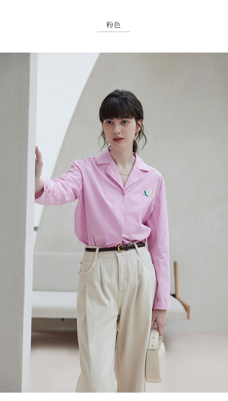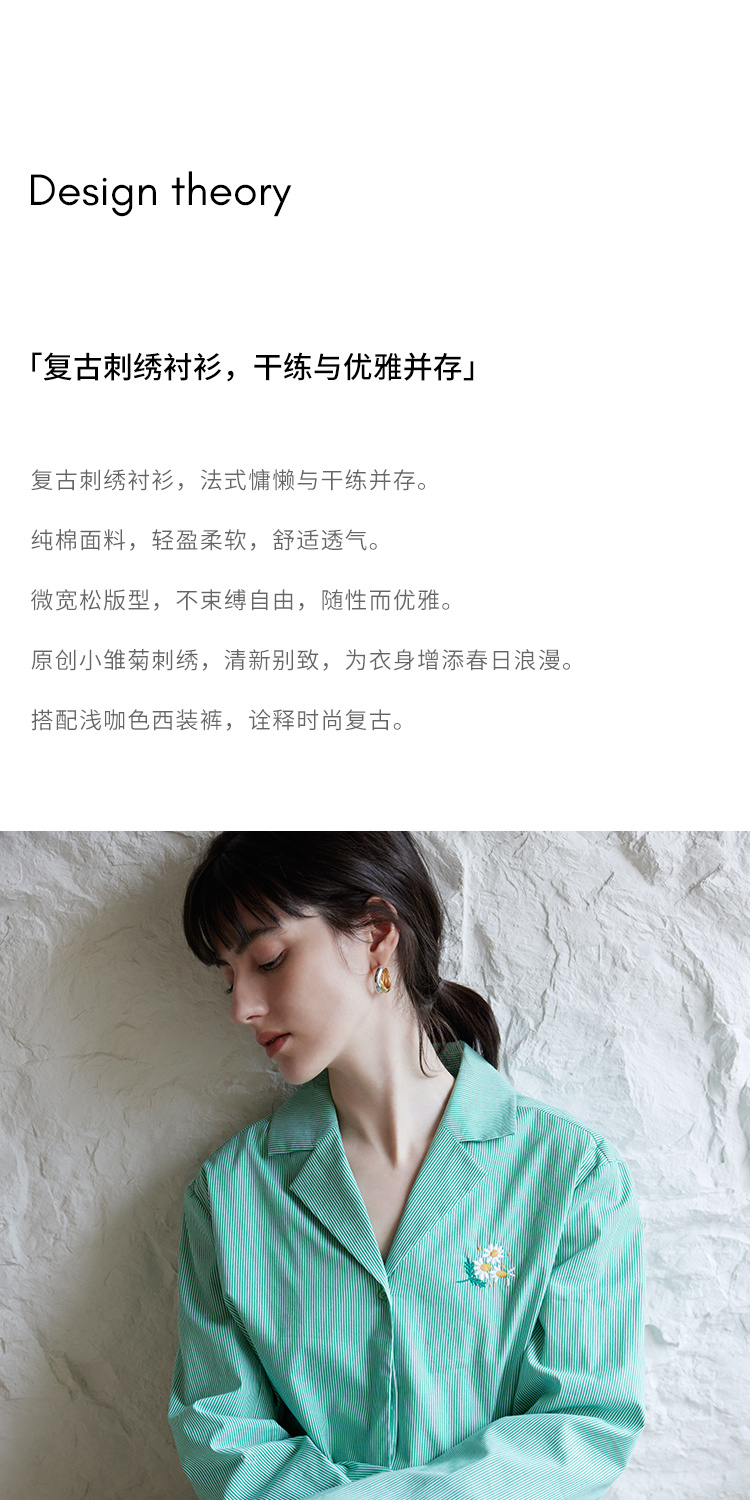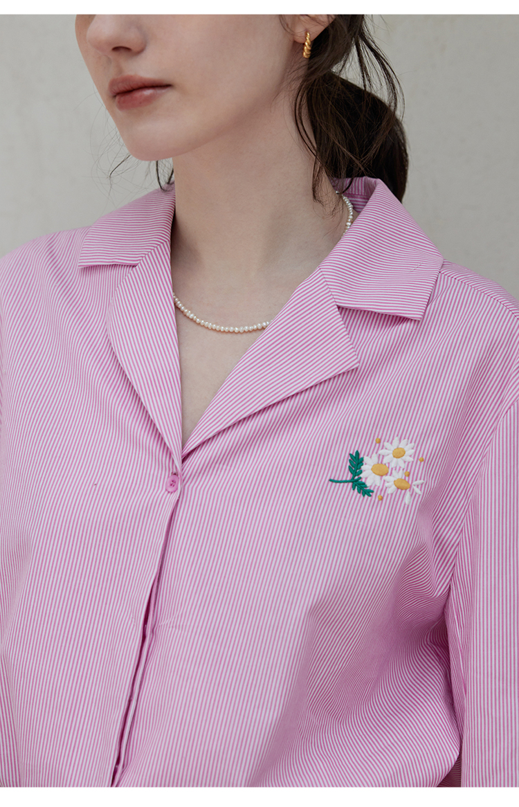 【周四精选福利】HeyDress条纹刺绣衬衣女法式复古V领小雏菊设计衬衣别致上衣