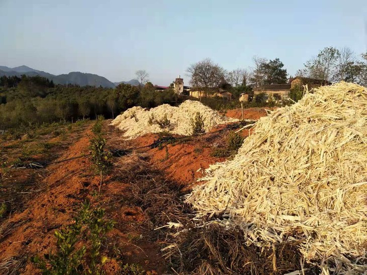 2017年冬开始,使用甘蔗渣覆盖表层土壤,保水保肥,到现在为止,果园的土地松软,甚至春夏季节时,果园多种野菌随处可见,有机质也越来越丰富。