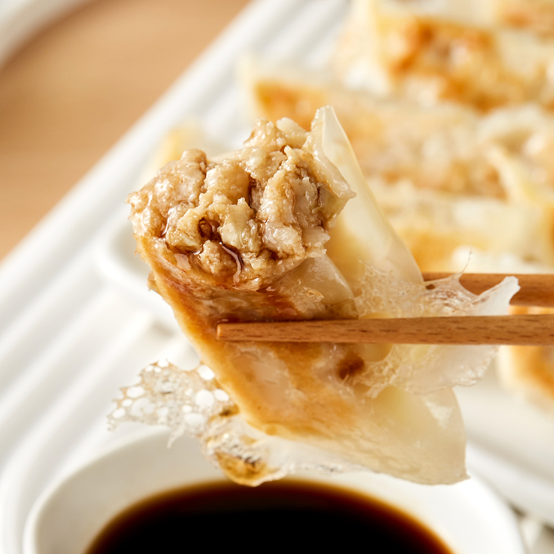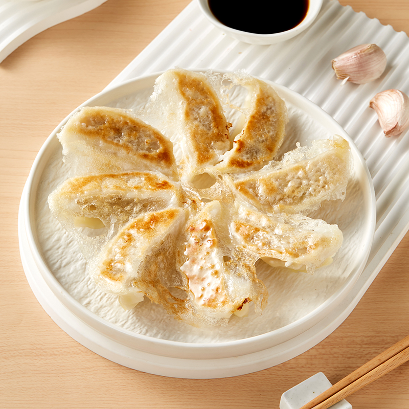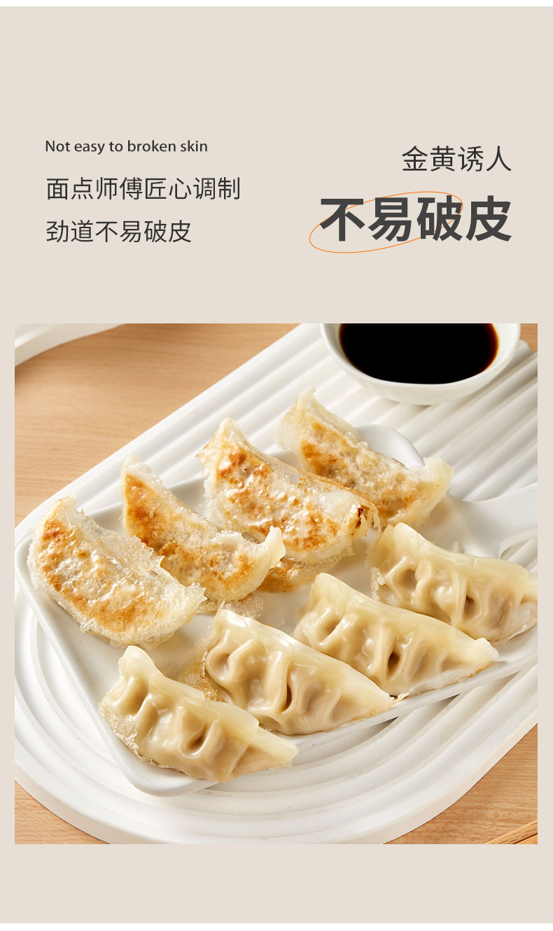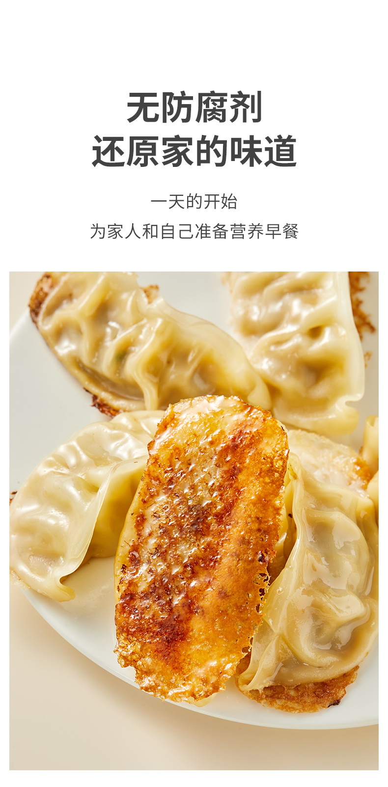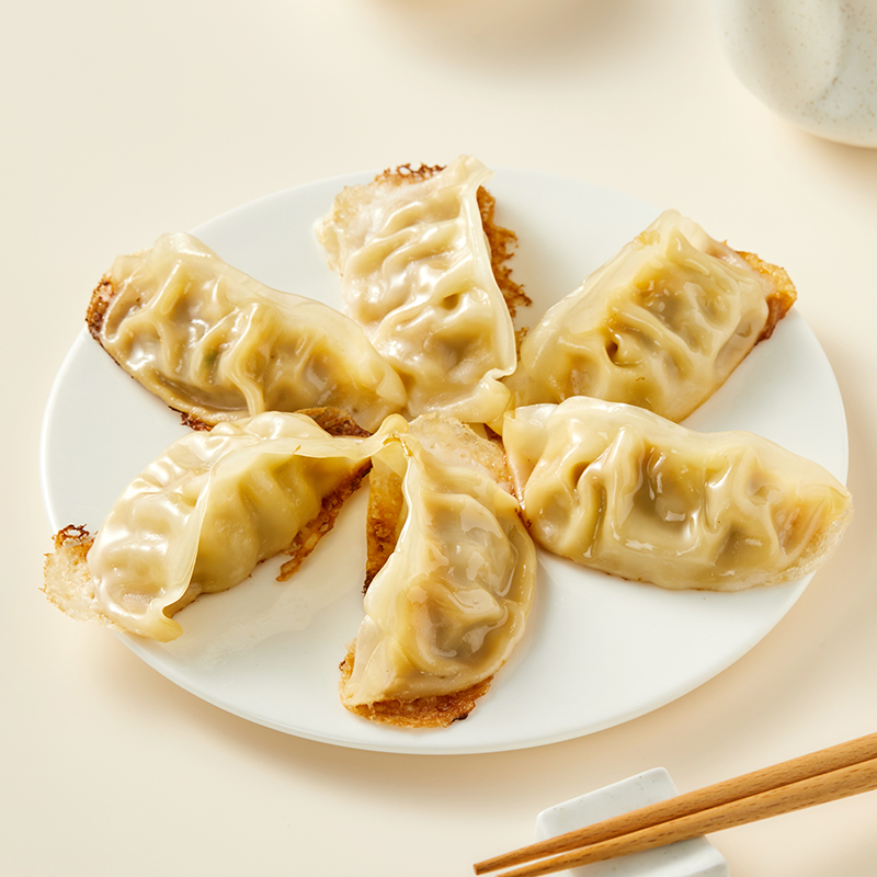 精选麦芯面粉,采用真空和面技术,制作出来的煎饺皮筋道弹牙,饱满又有韧性,不易破皮。