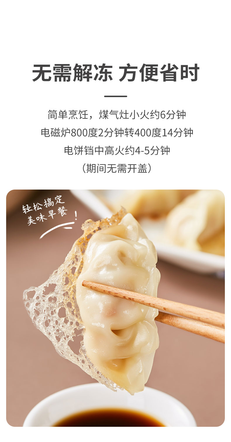 以前吃的煎饺,都是需要在锅底放一点薄薄的油,才可以受热均匀,不至于糊底。我们这款煎饺的特别之处在于无需解冻,也不需要额外加油加水,直接在不粘锅上开小火慢煎即可。