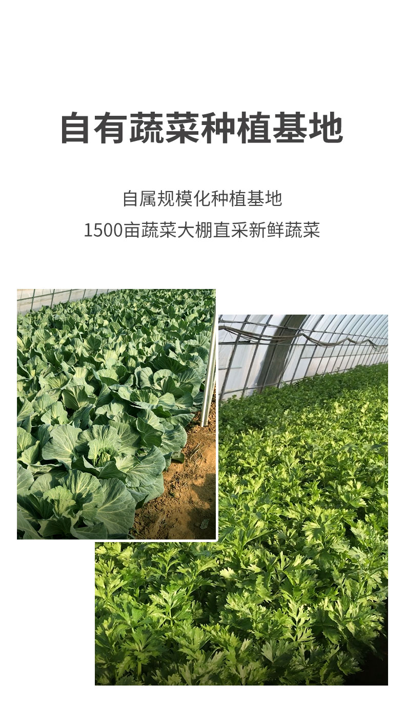 自属基地种植,1500亩蔬菜大棚直采新鲜蔬菜,规模化种植,品质可控,源头可控。在食品安全把控方面做到了精益求精,安全又健康!都可以闭着眼睛放心入!