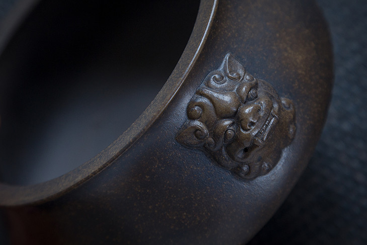为彰显青铜器的古拙效果,特意采用紫砂拼配泥料。