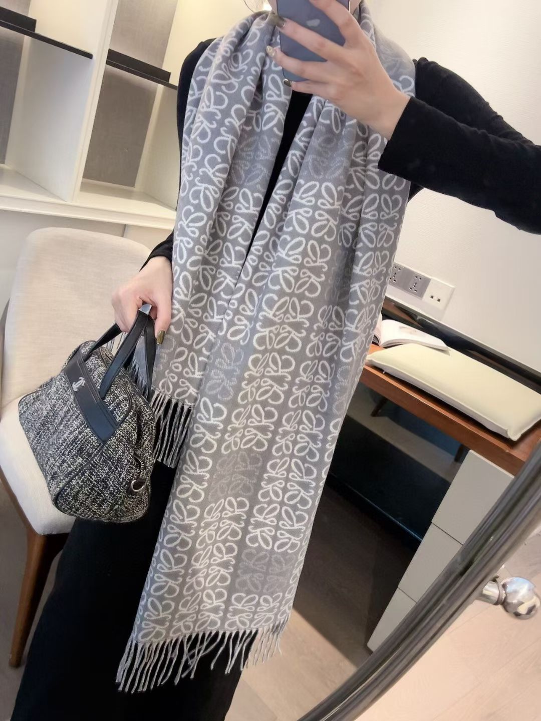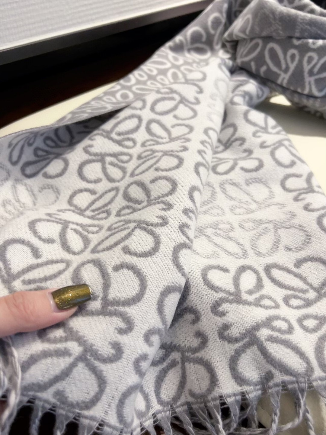 Loewe双面围巾 180*60cm 90%羊毛10%羊绒,罗意威新款,Khaki Green双色羊毛提花毛毯披肩,饰有重复 Anagram 图案,对比色 LOEWE L 图案和流苏边缘。妥妥的25年C位围巾🧣超级难遇的Loewe 围巾,大logo,而且特别大,当毯子也没问题,可以当披肩,可以当围巾,超级舒服,温柔高贵,太适合秋冬了。材质:纯羊毛,《今年的神仙围巾🔥冬季买不到系列🔥》