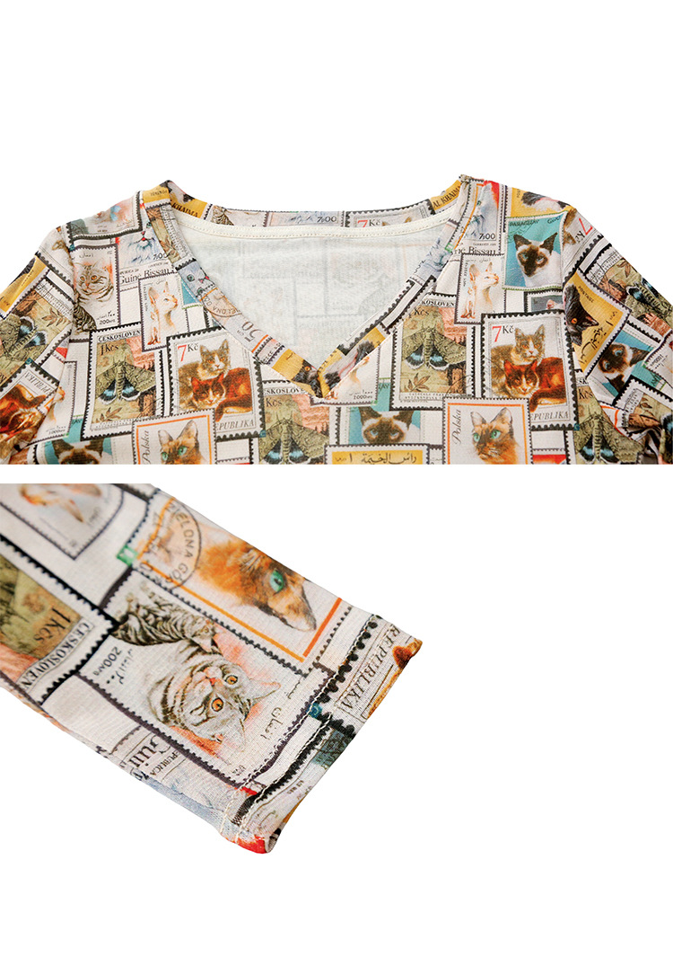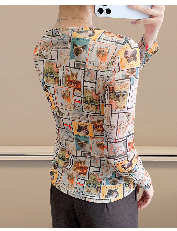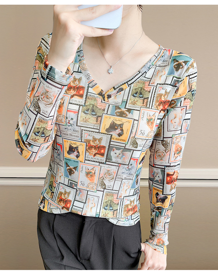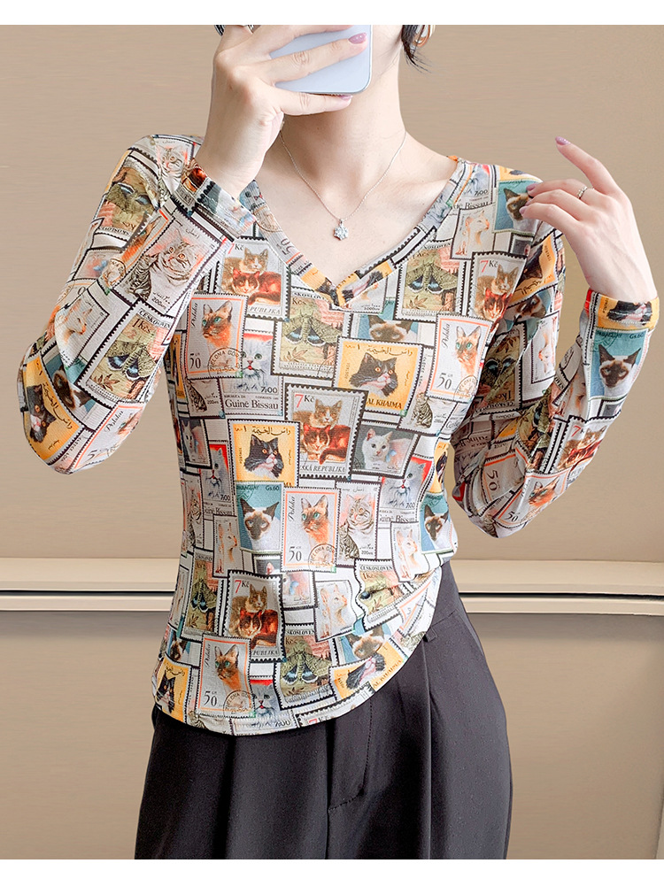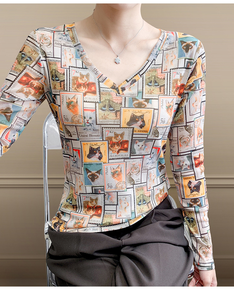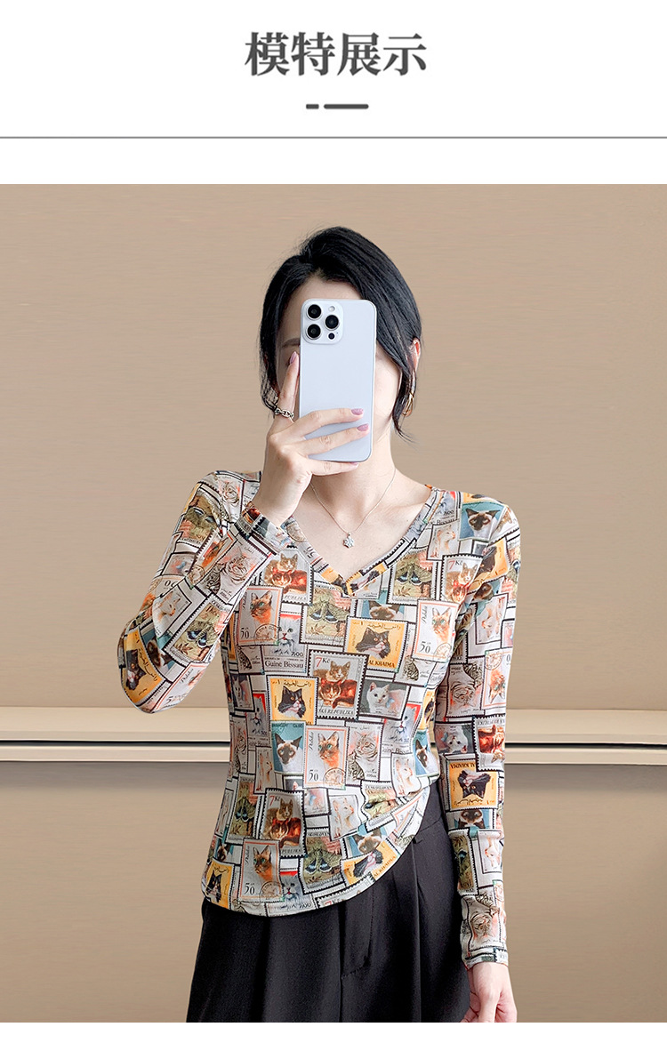 KQL欧货女装2025秋冬时尚洋气高弹网长袖印花V领T恤打底衫上衣批发