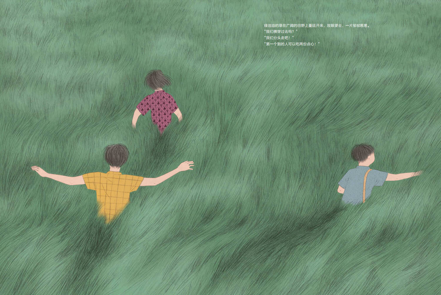 他们快步经过邻居家狂吠的狗,穿过绵羊牧场,走进淹没双腿的草丛中——