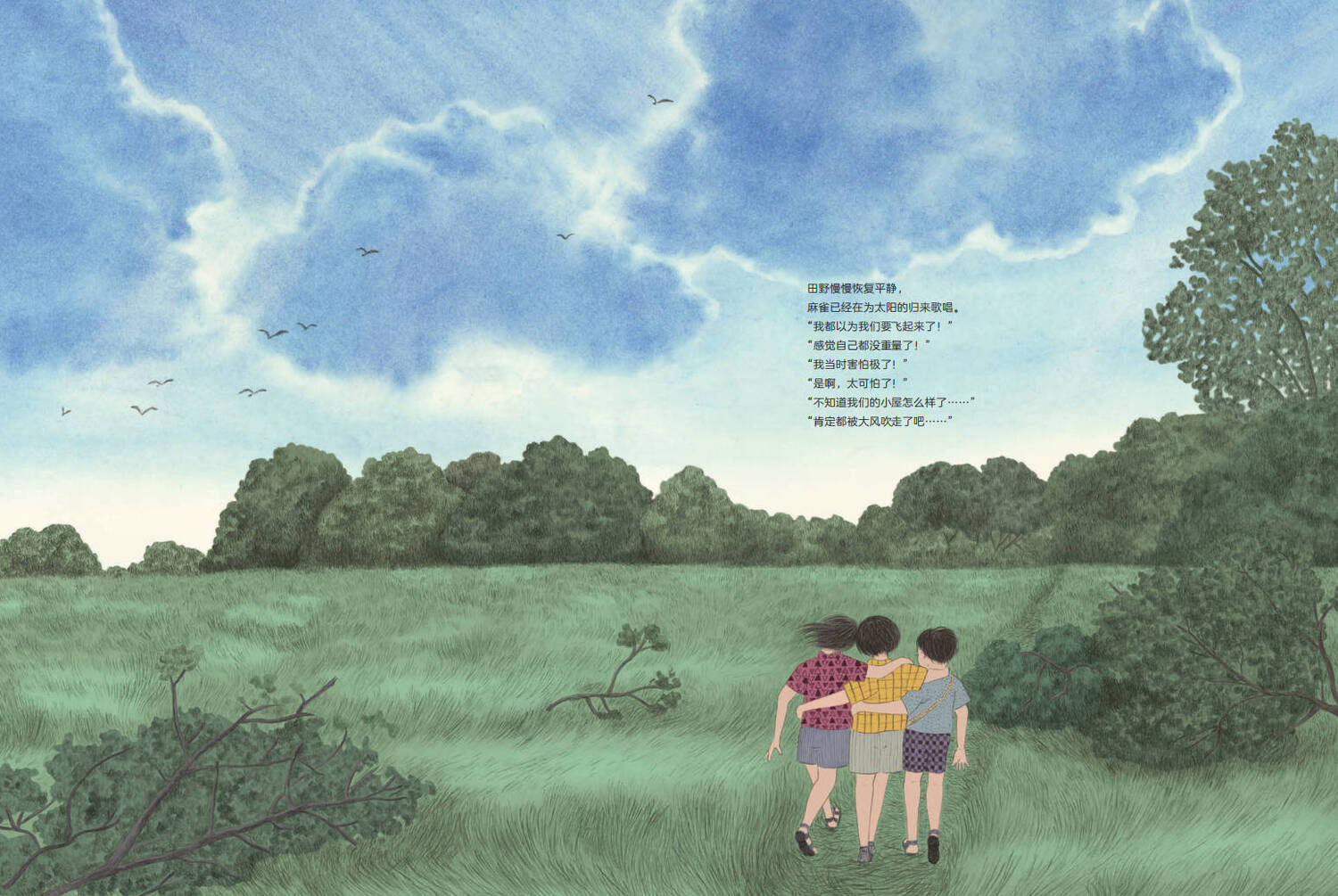 大风渐渐停息,天晴了,三个好朋友继续前行。