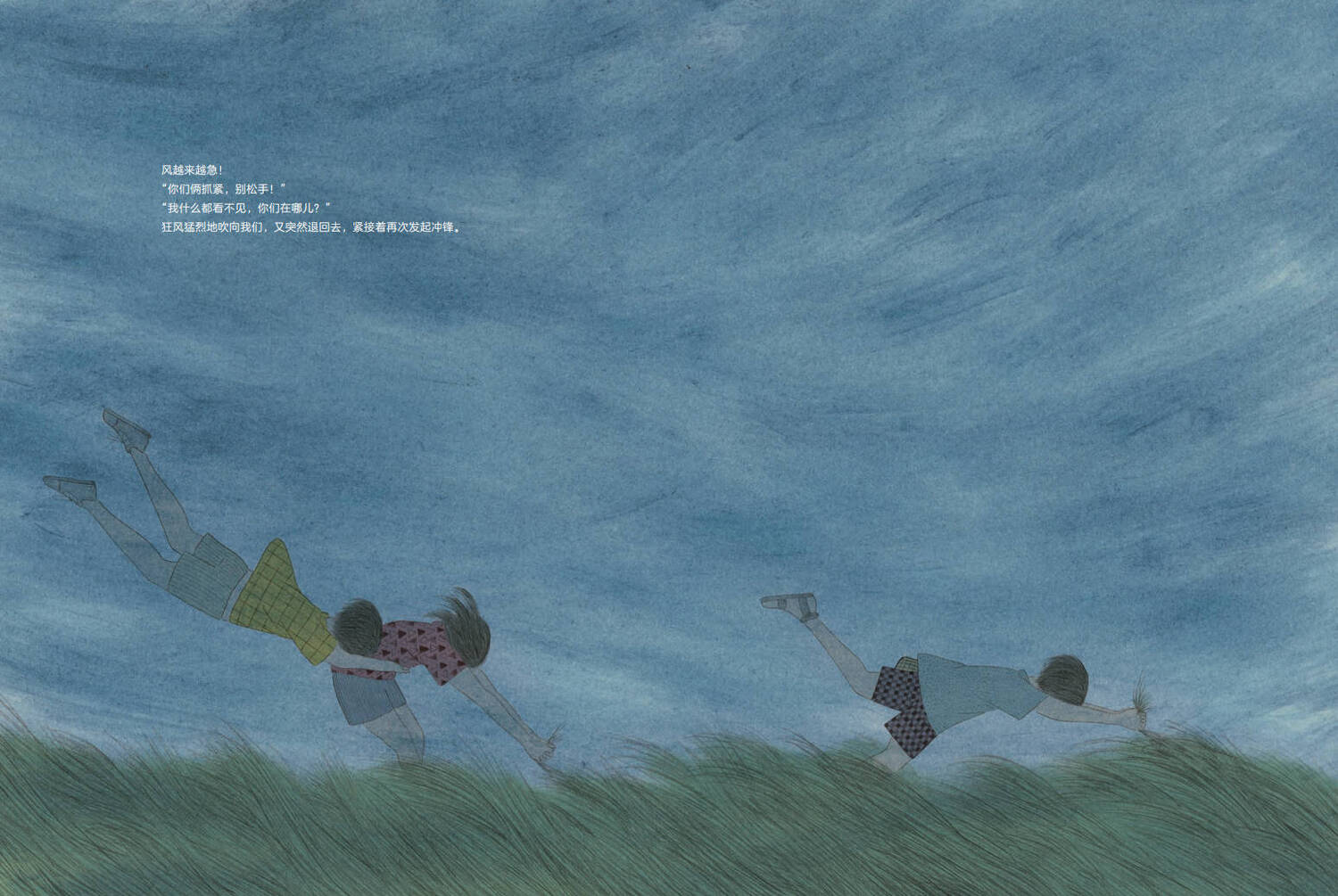 他们用力抓住身边的一切,抱紧彼此,在大风中努力站稳……