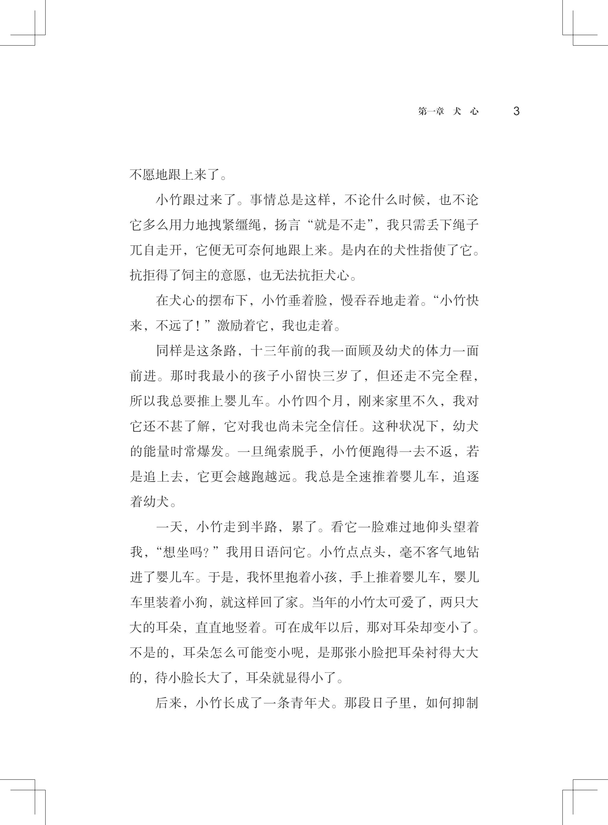 和狗狗们生活在一起,日子几乎是一成不变的。好些年来一直吃同样的东西,走同样的路线,重复着同样的期待,同样的固执,同样的行为模式。一觉醒来,同样的日子还在继续。定睛一看,同人类一样,死亡正在它们身上日渐鲜明,而与死互为表里的生,也同样变得鲜明起来。这段日子里,完成这本书的日子里,同小竹生活的最后几年里,我从小竹的一举一动中思考着何为生死。而在小竹已故的现在,那些思绪再次离我远去,散步与进食的往复再次回归我的日常生活。湿漉漉的舌头、摇来摆去的尾巴,还有永远仰望着我的眼神,是它们用身体,将体重与体温托付给了我。