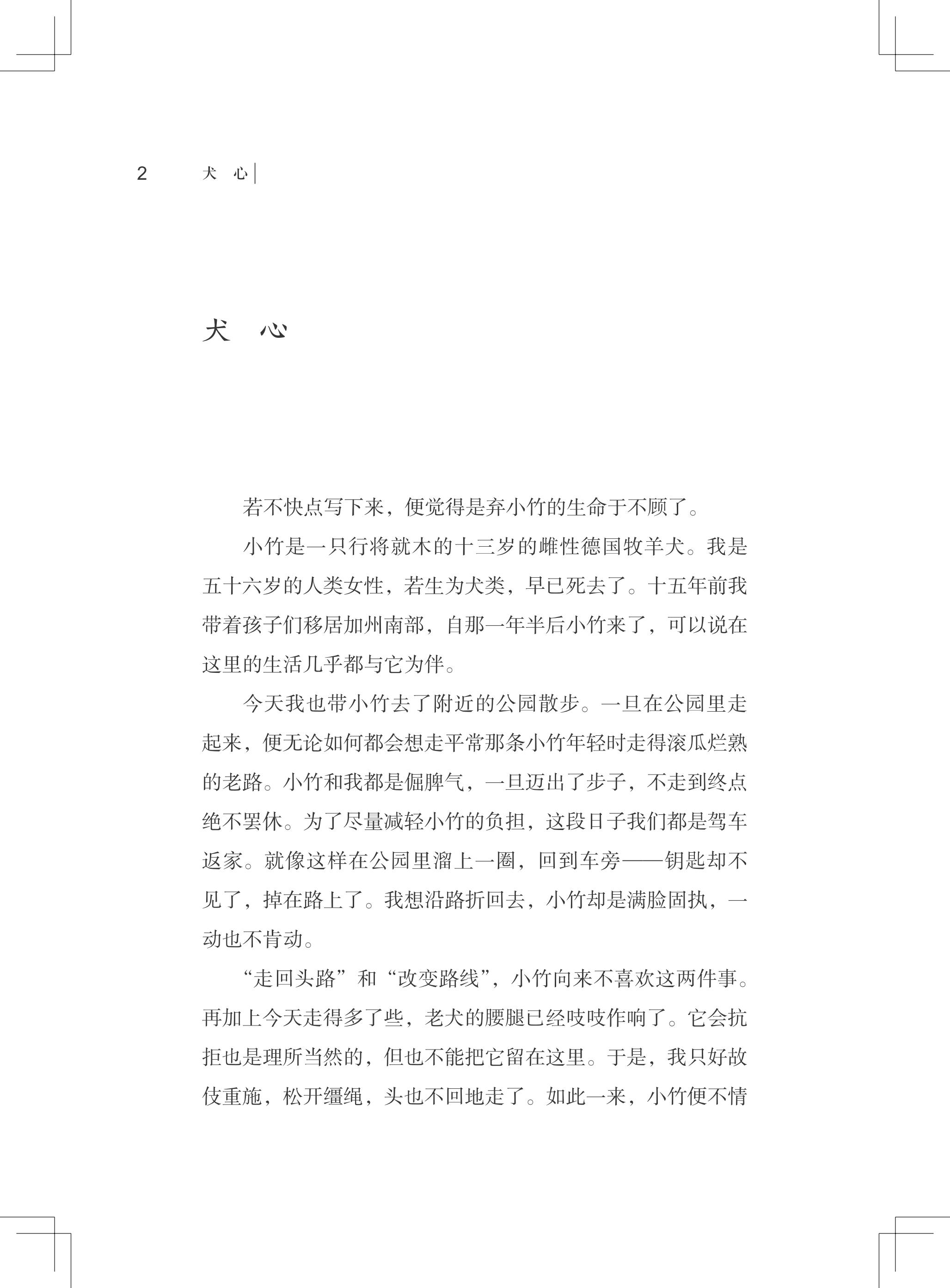 在作者的记述中,牧羊犬小竹已经临近死亡。曾经健壮漂亮的爱犬日渐衰老,逐渐走不动路、吃不动东西,就连排泄也无法随心所欲。盛时愈盛,则衰时愈哀,回忆起小竹年轻强壮的日子,它难堪的体态、悲哀的生存模样引起了作者一重重的思绪,并让她想起同样年迈、独自一人居住的父亲。颠三倒四诉说的病痛、身体无法自理的苦闷透过电话线,从遥远的故乡一声声传到同样也不年轻、却得扛起家庭重任四处奔波的女儿耳中。身边的小竹虚弱的身影和父亲的模样重叠起来,更加让人无法直视生命与死亡的重量。自然的力量无法抗拒。我们该怎样面对死亡?是顺其自然,还是千方百计延缓死亡的到来?随着作者平静的笔触,读者们随之将衰老与死亡的命题投射到自身,开始思索并面对这些问题。