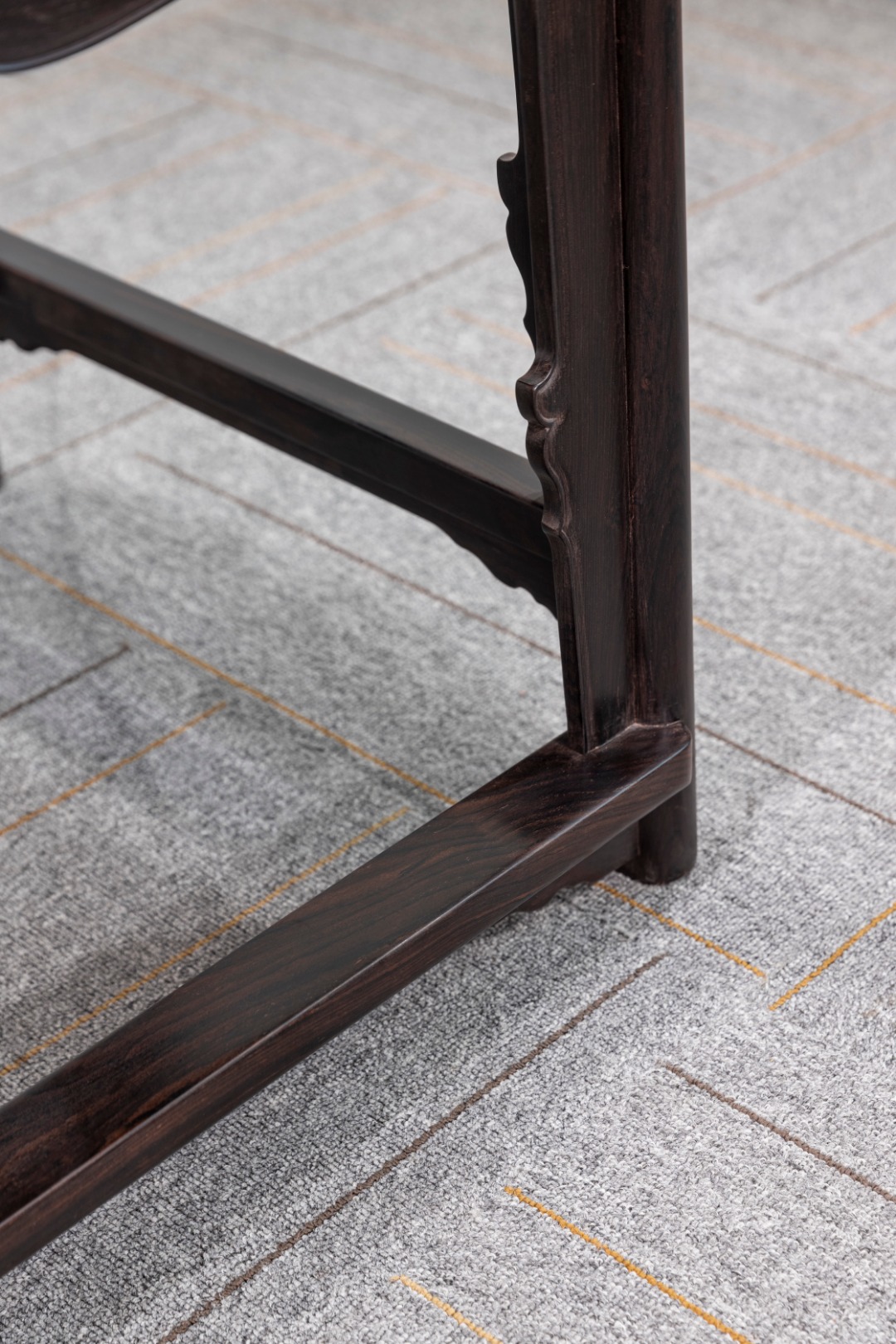 四出头官帽椅,为紫黄家具中最早的经典形制之一。此椅搭脑牛头大弯向后,鹅脖退后安装又加联帮棍,木石结合,铭文镌刻,是兼具力量、威仪与主人偏好的一种。