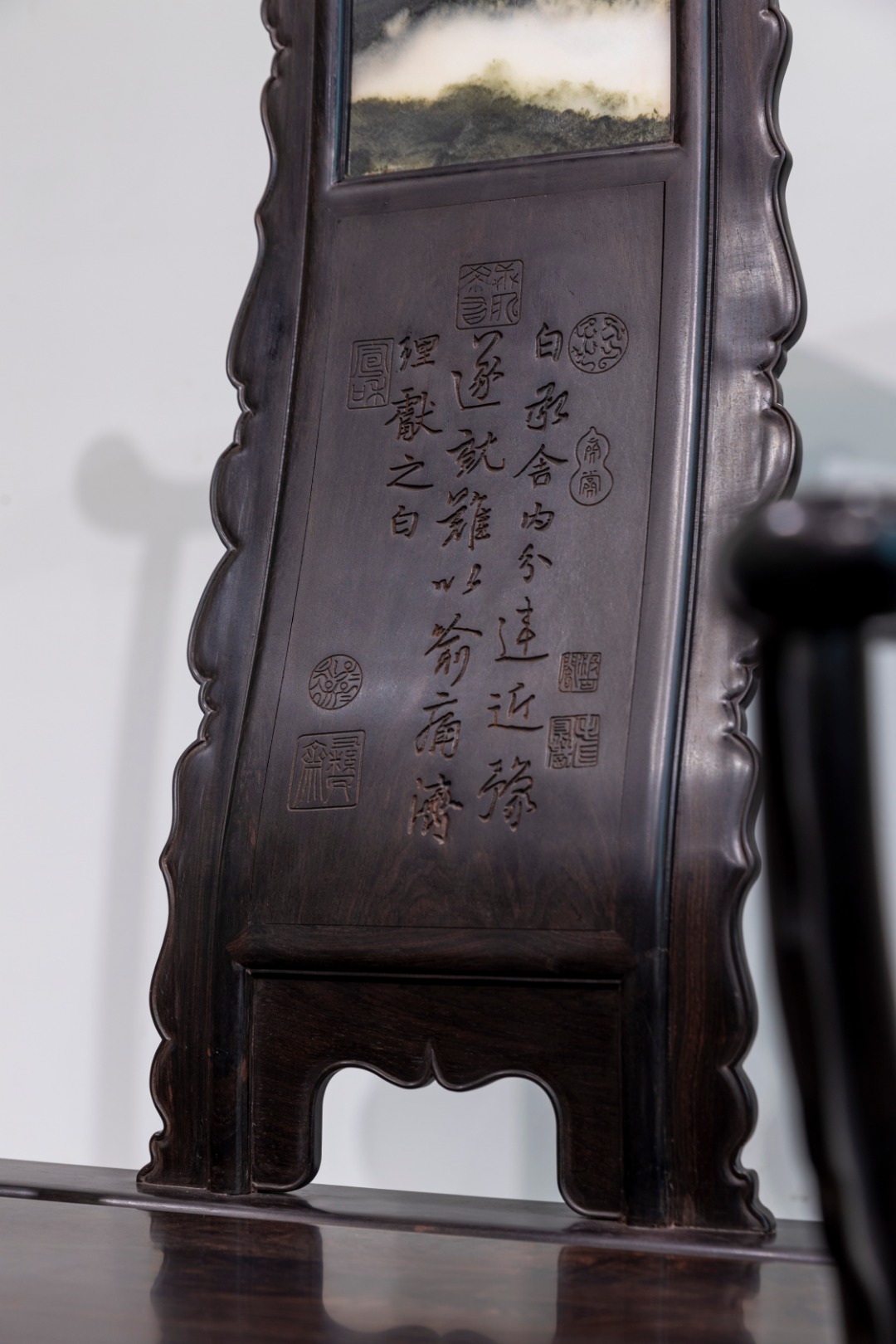 此椅搭脑中部微凸呈斜坡,两端弯曲向后兜转,扶手“一波三折”,呈大小双“曲率”。三弯式靠背转折有力,攒框压边线,上段镶云石,白质黑章;中段面心阴刻铭文、铃印;下段亮脚,两侧带花牙装饰。整器多用花牙装饰,靠背板两侧最为直观,鹅脖退后也接挂牙,椅盘下三面壶门式券口,对应枨下牙板也带花边,装饰似简实繁,线条似繁实简。四足侧脚明显,下盘稳重,上盘挺拔,整器浑厚圆润,刚柔相济。