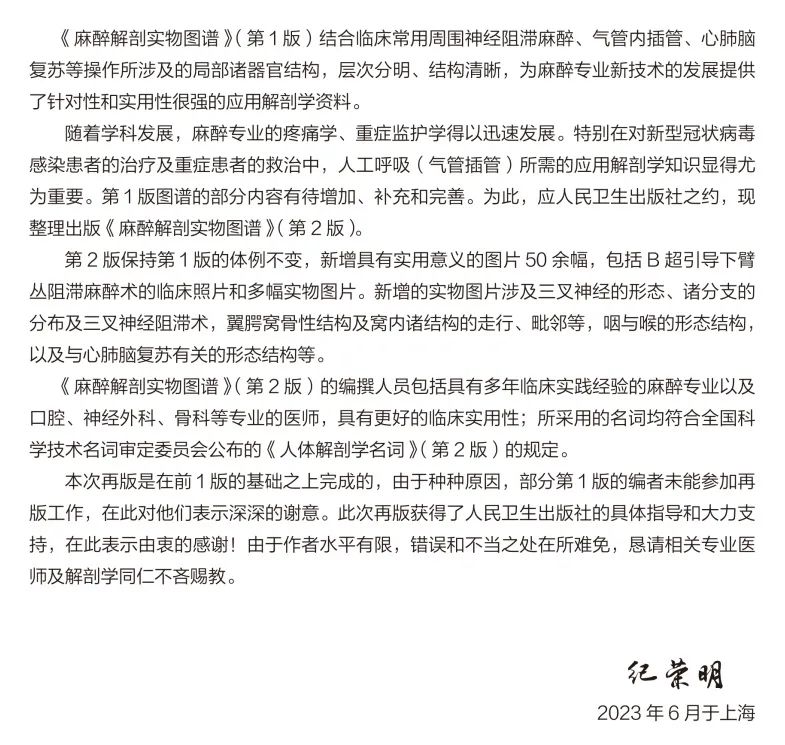 第2版保持第1版的体例不变,新增具有实用意义的图片50余幅,包括B超引导下臂丛阻滞麻醉术的临床照片和多幅实物图片。新增的实物图片涉及三叉神经的形态、诸分支的分布及三叉神经阻滞术,翼腭窝骨性结构及窝内诸结构的走行、毗邻等,咽与喉的形态结构,以及与心肺脑复苏有关的形态结构等。