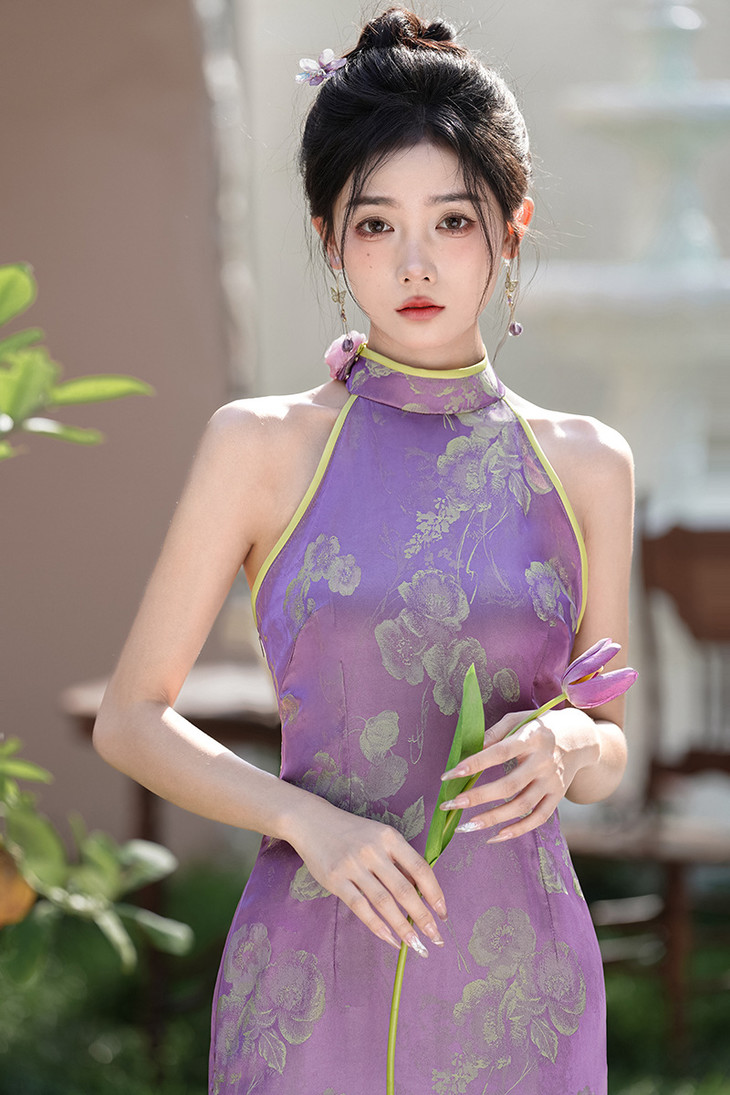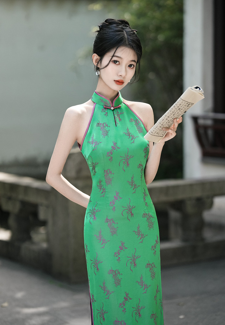 改良日常挂脖新中式,长款修身露锁骨国风旗袍XL24136