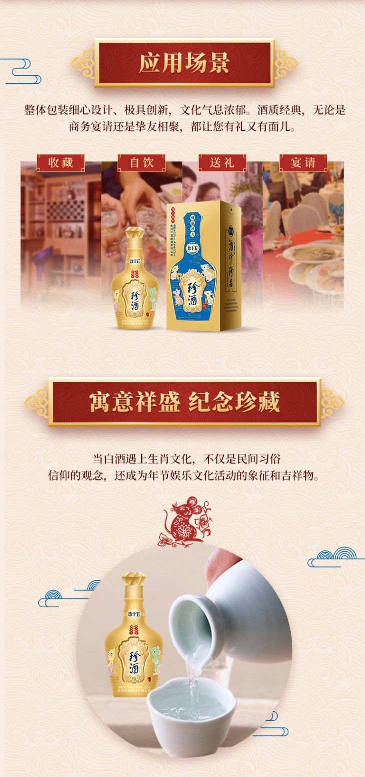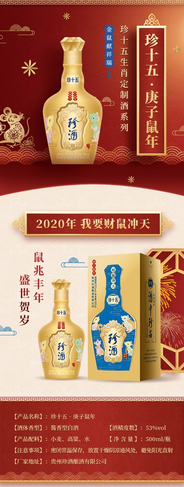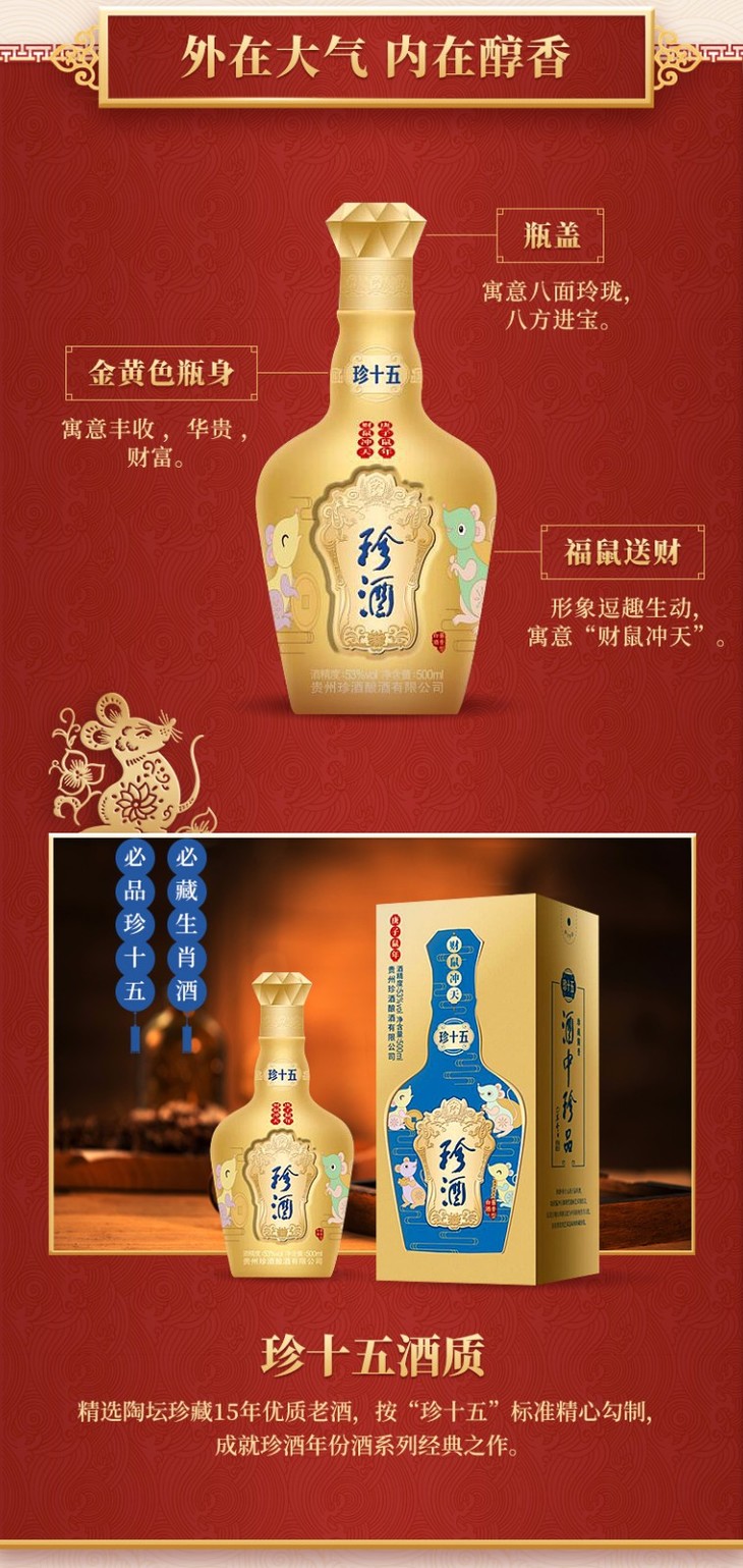 【推荐】珍酒 珍十五 鼠年纪念酒 酱香型白酒 53度500ml 酒中珍品 珍藏酱香