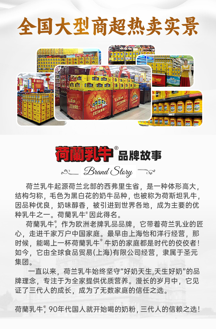 荷兰乳牛品牌于1990年进入中国,相伴31年始终致力于为更多家庭奉上优种荷兰乳牛带来的营养与美味。秉承“珍选至纯营养,传承经典醇香”的理念,打造一个覆盖全人群、多品类、高品质的国际化品牌。