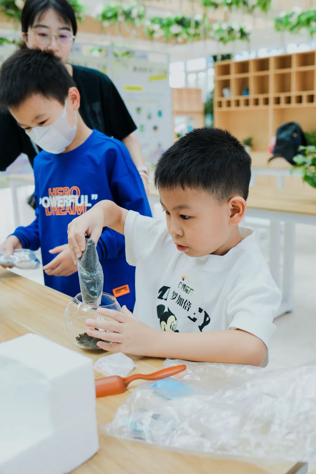● 用植物、搭配苔藓以及各种配件,做出了一个微生态瓶,都市里的孩子,在这里化身小小园艺师。同时培养孩子的安全意识、探究意识和动手实践能力。