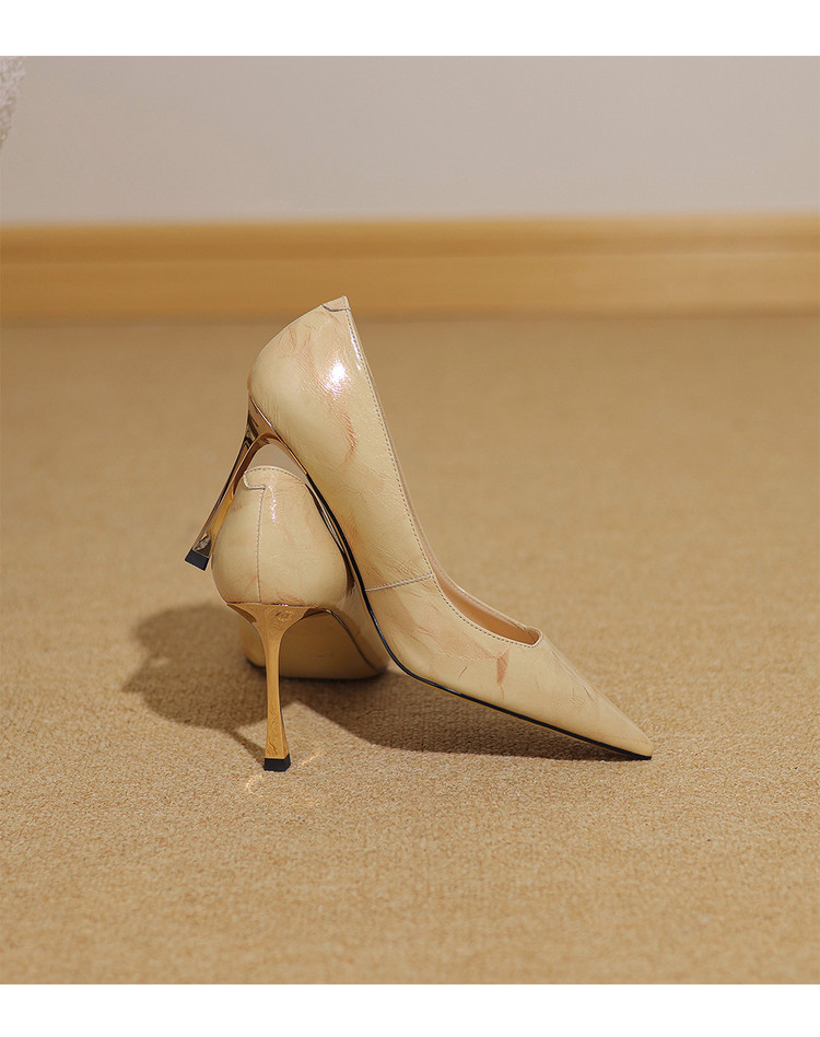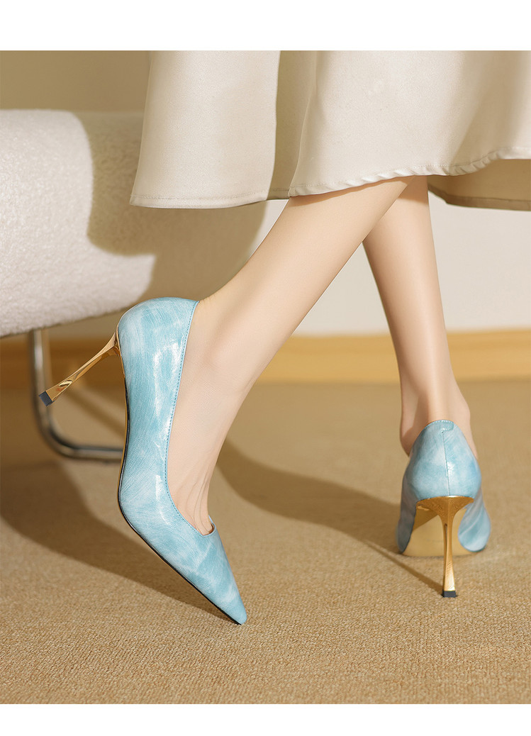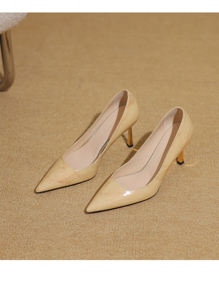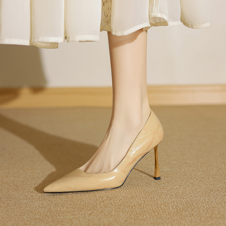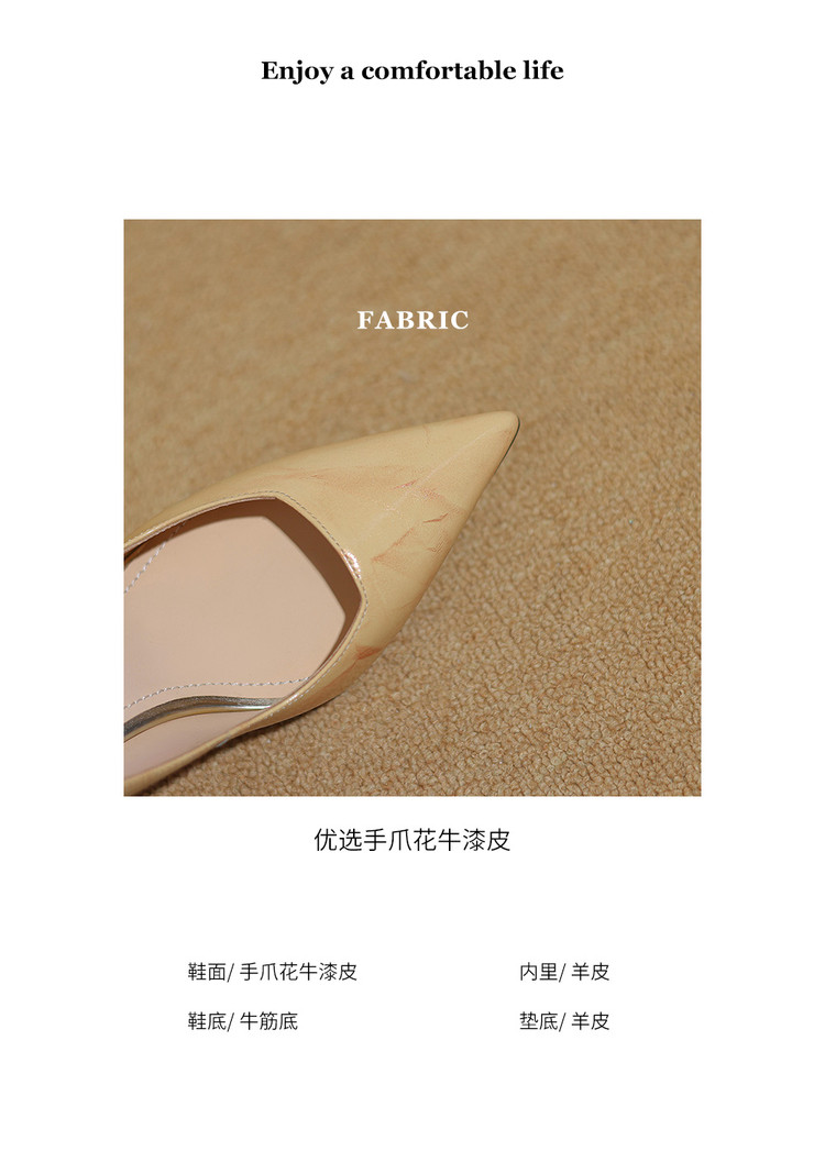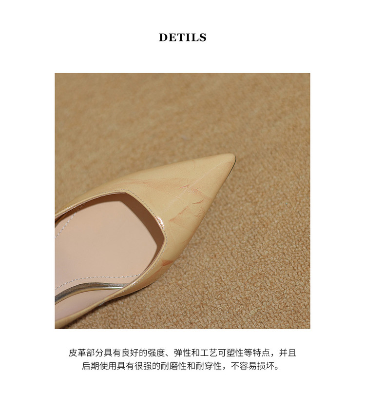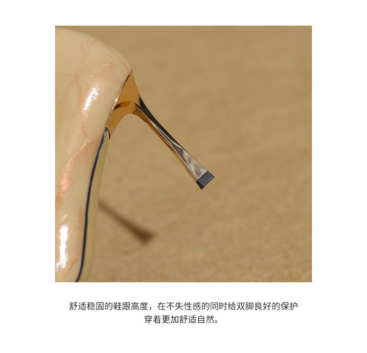 【货号】M1091-1【帮面材质】牛漆皮【鞋垫】羊皮垫【内里材质】羊皮里【鞋底材质】牛筋底【跟高】8.5CM【颜色】杏色、天兰色【尺码:】34-39
