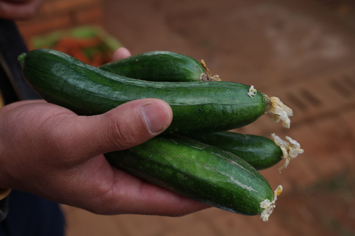 这两年我们春秋季都能吃上来自云南返乡青年洪炜种的生态水果玉米,每一口都是爆浆的甘甜,沁人心脾。今年的水果玉米还没成熟,但洪炜种了点小黄瓜,量很少,只能限量供应。