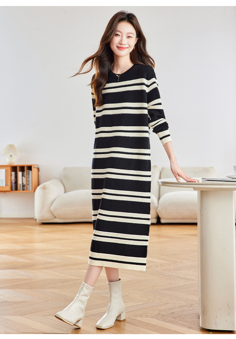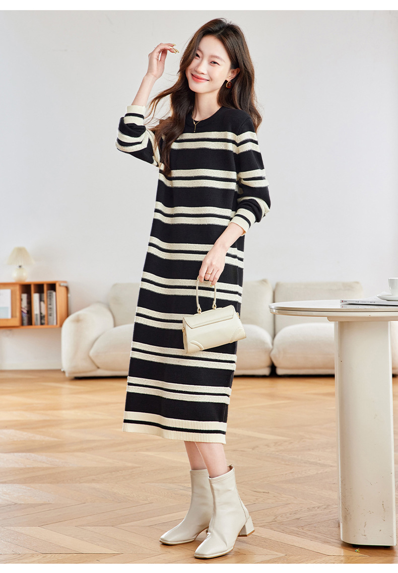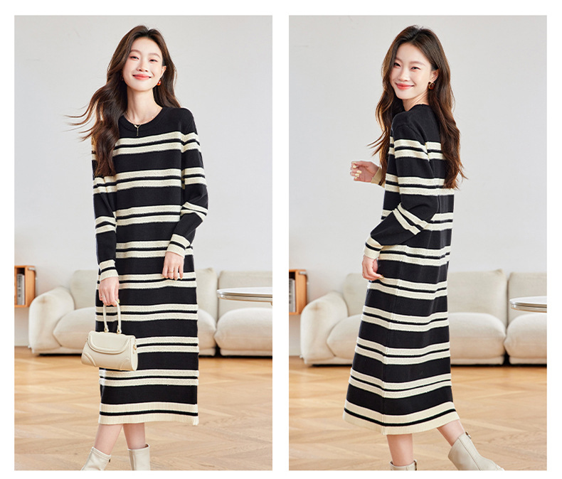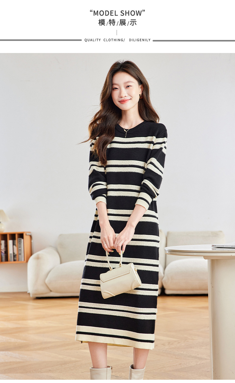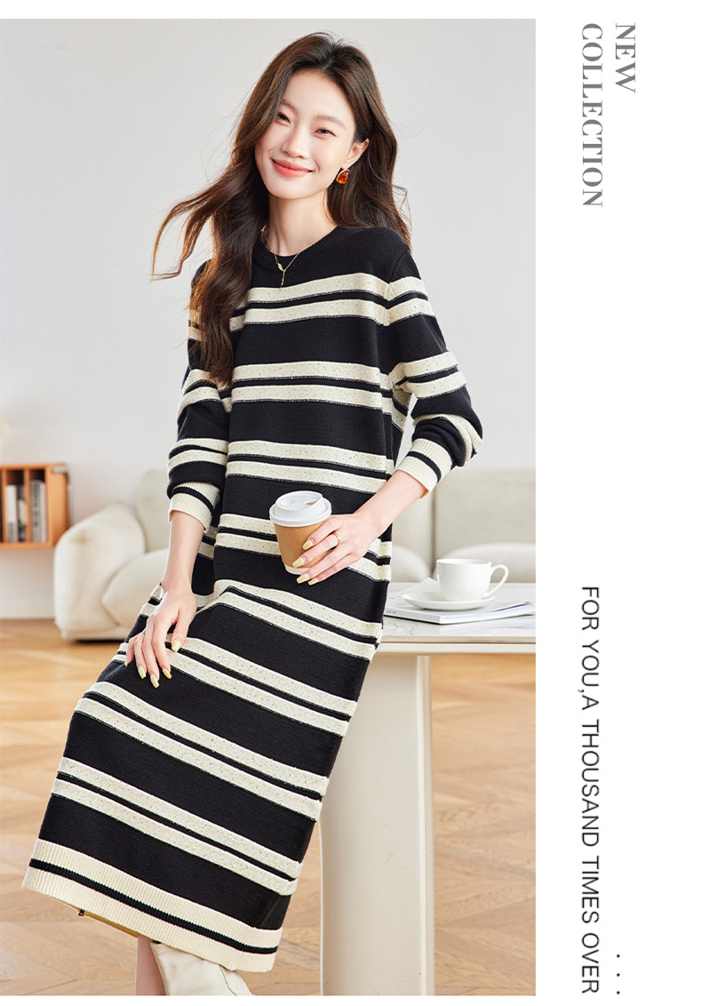 雀说圆领条纹针织连衣裙新款穿搭中长款过膝毛衣打底裙AL8511