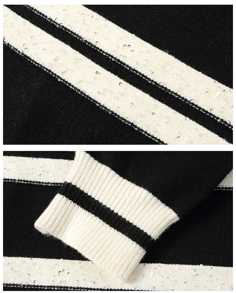 丁摩 100%纯羊毛春季新女式圆领条纹拼色宽松系扣打底针织开衫外套6ZF-299