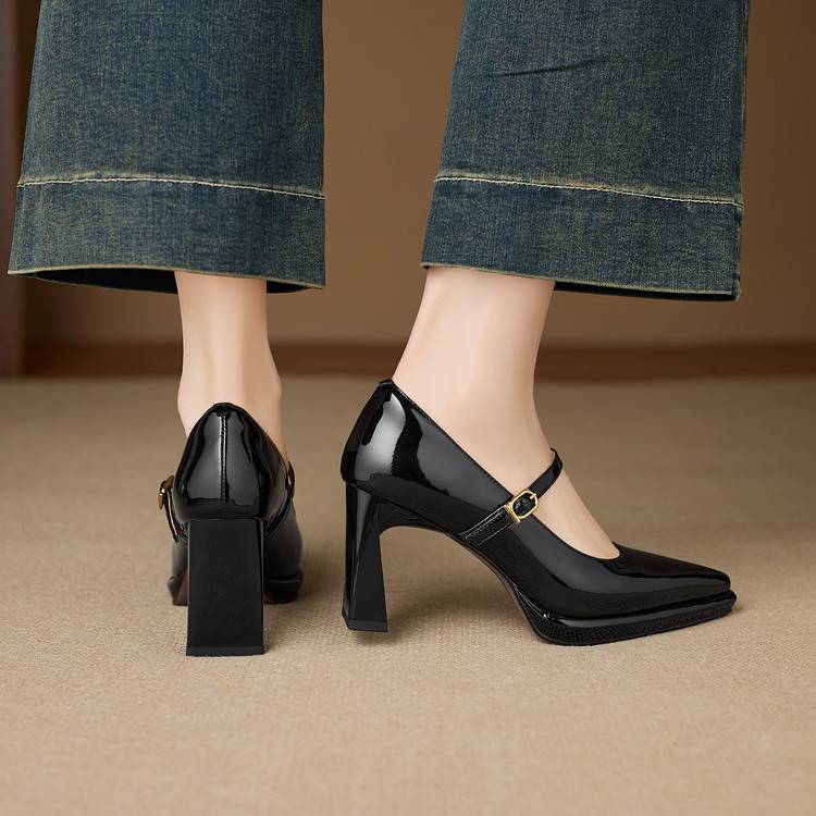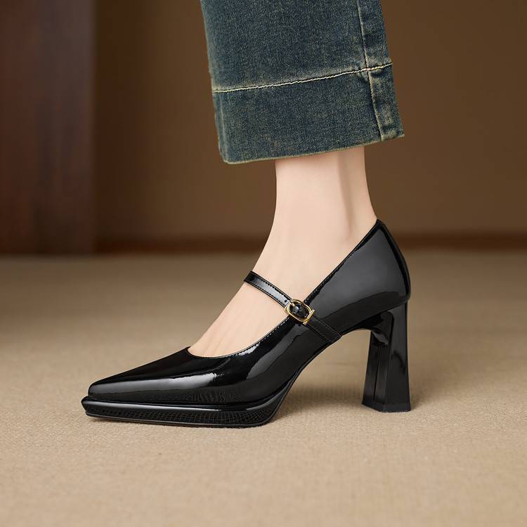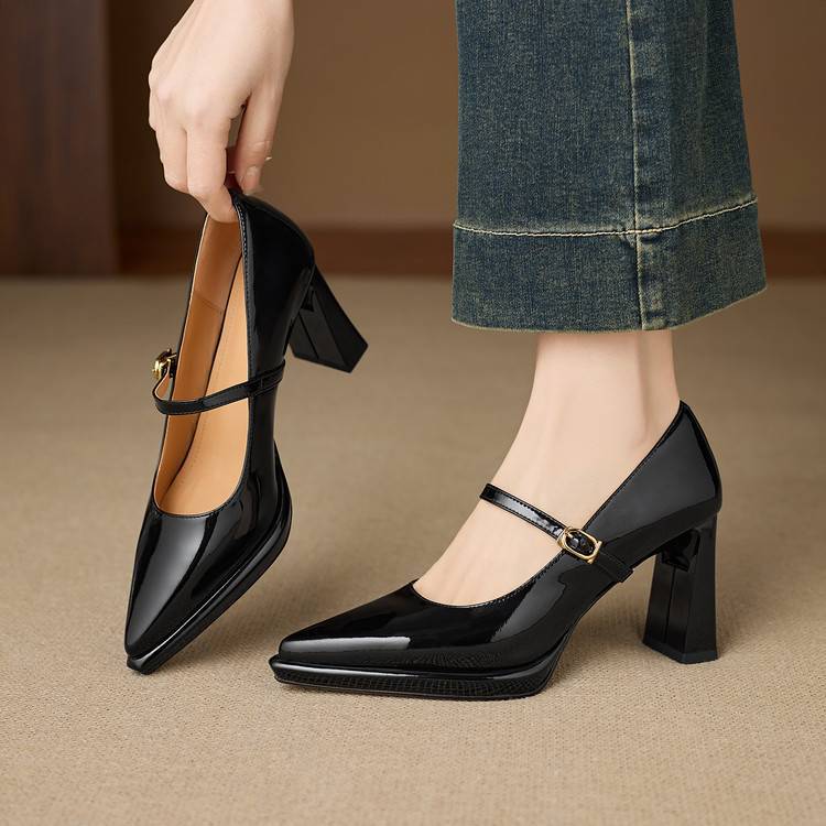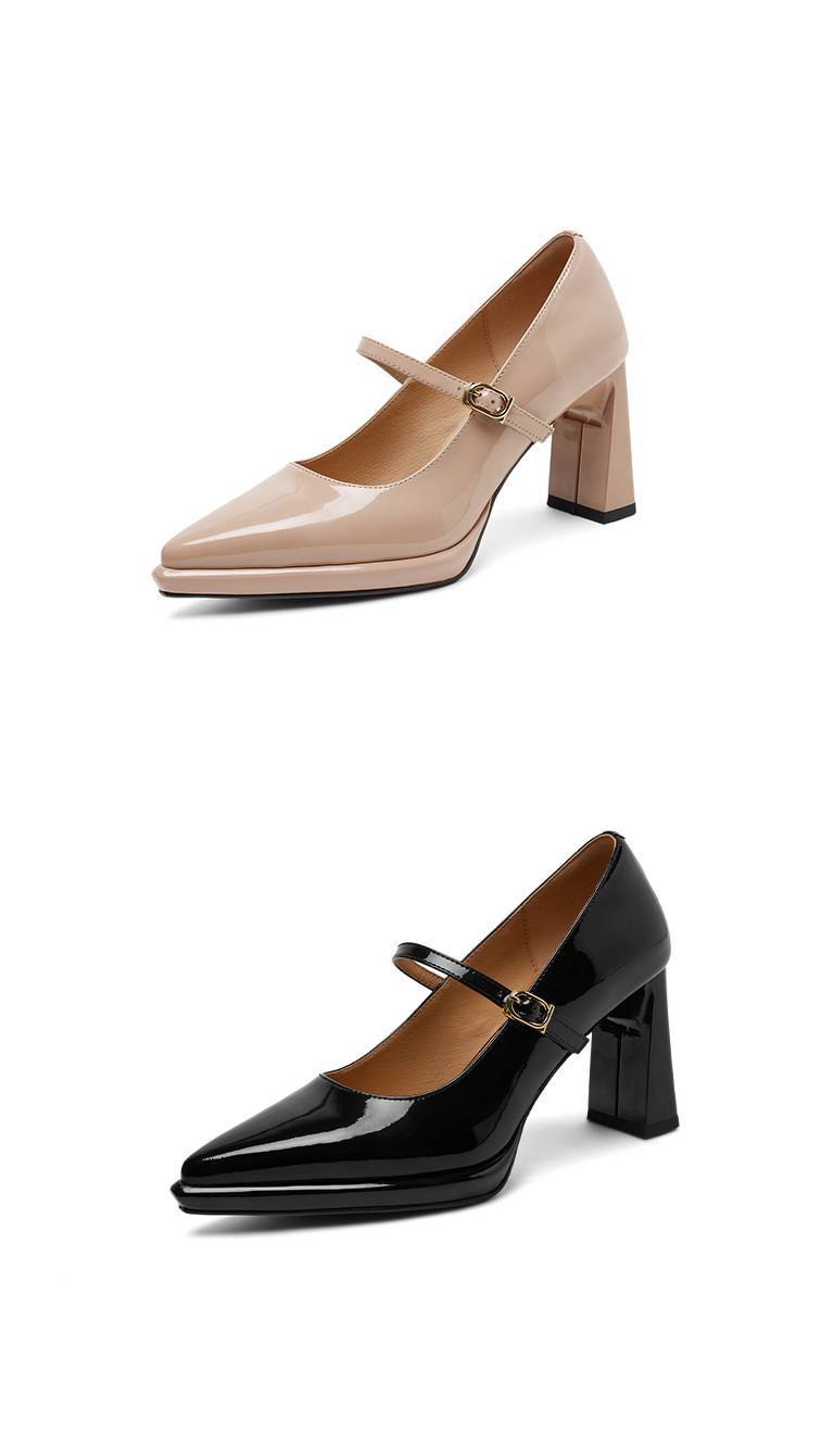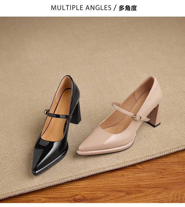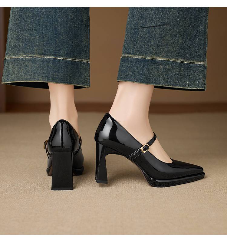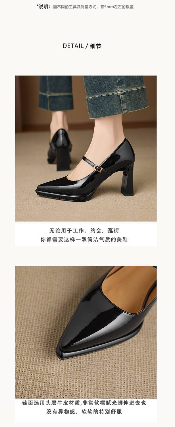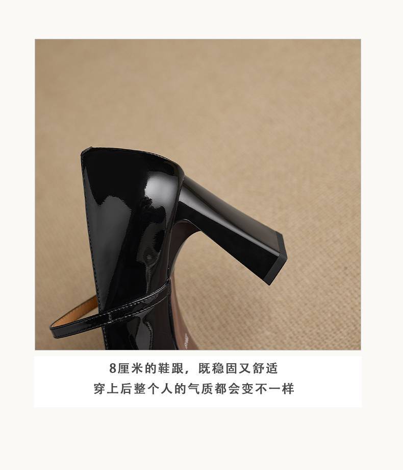 【预售5天】漆皮尖头粗跟单鞋女一字扣带高跟鞋防水台浅口职业鞋时尚款小皮鞋NWS1&N9879