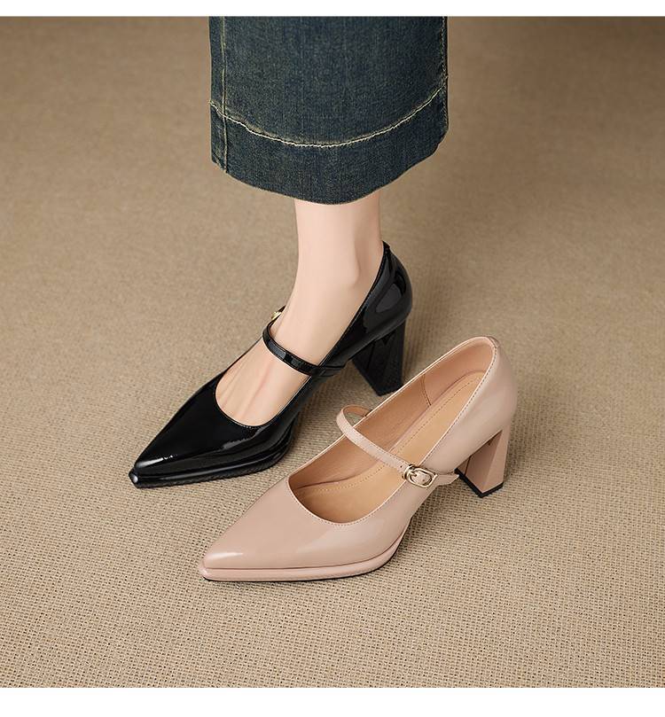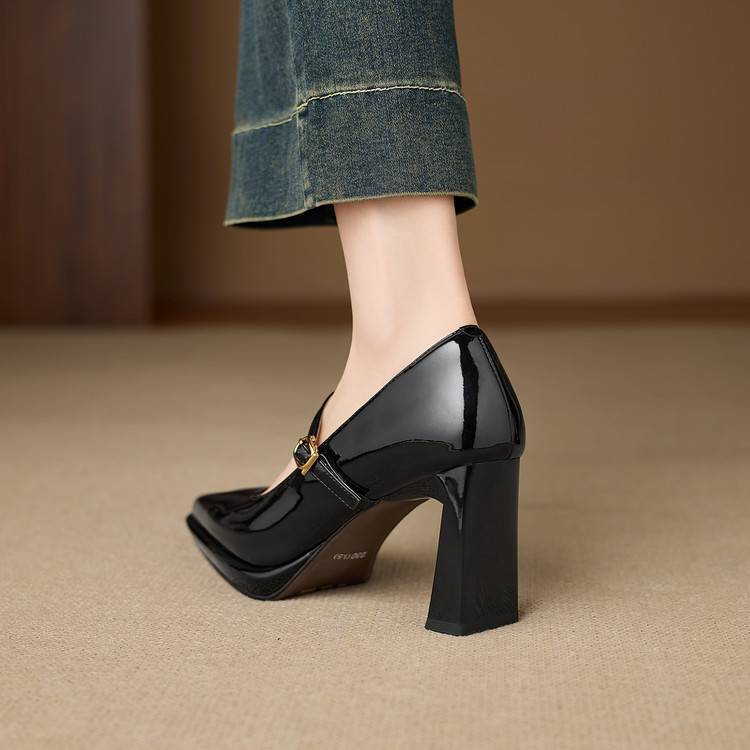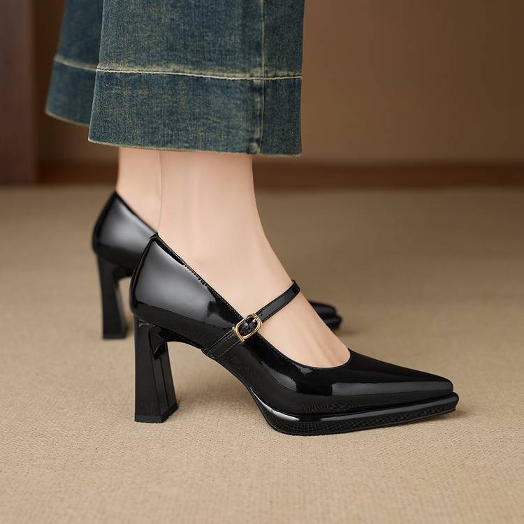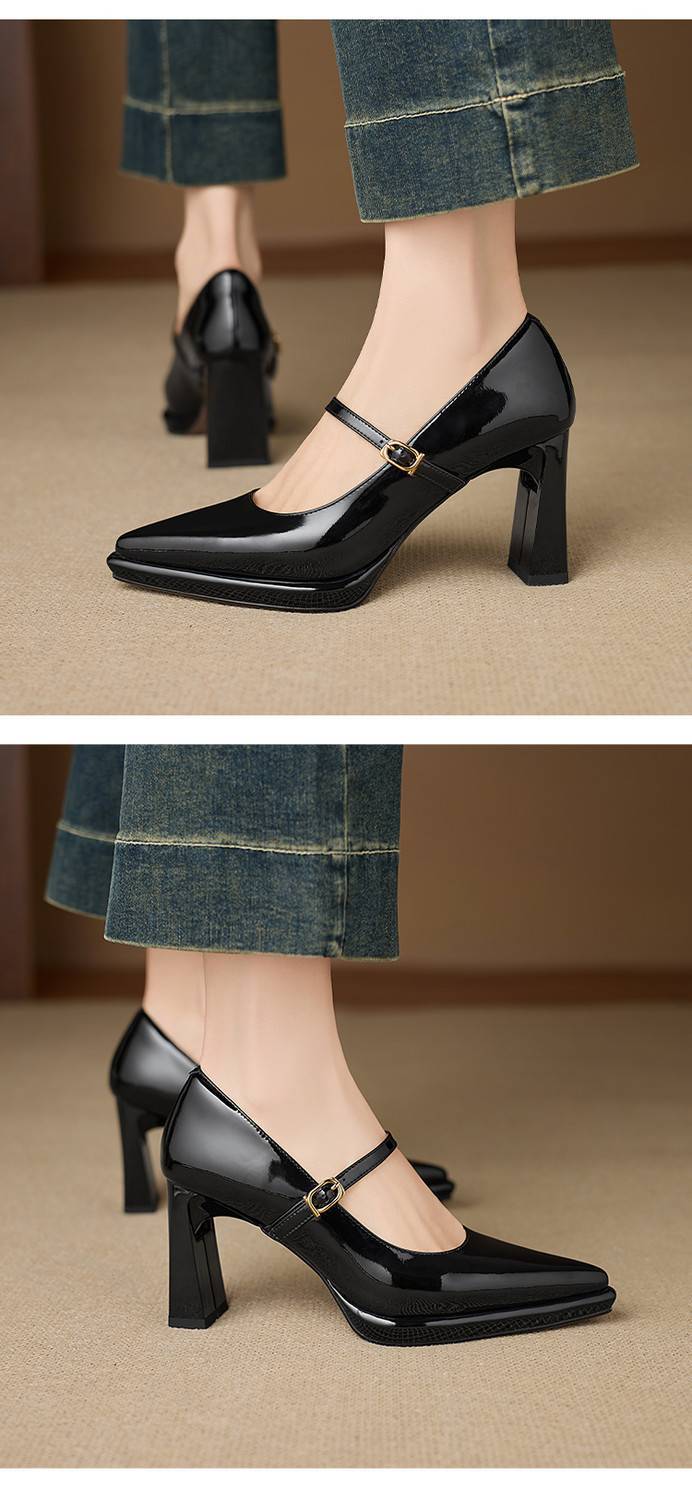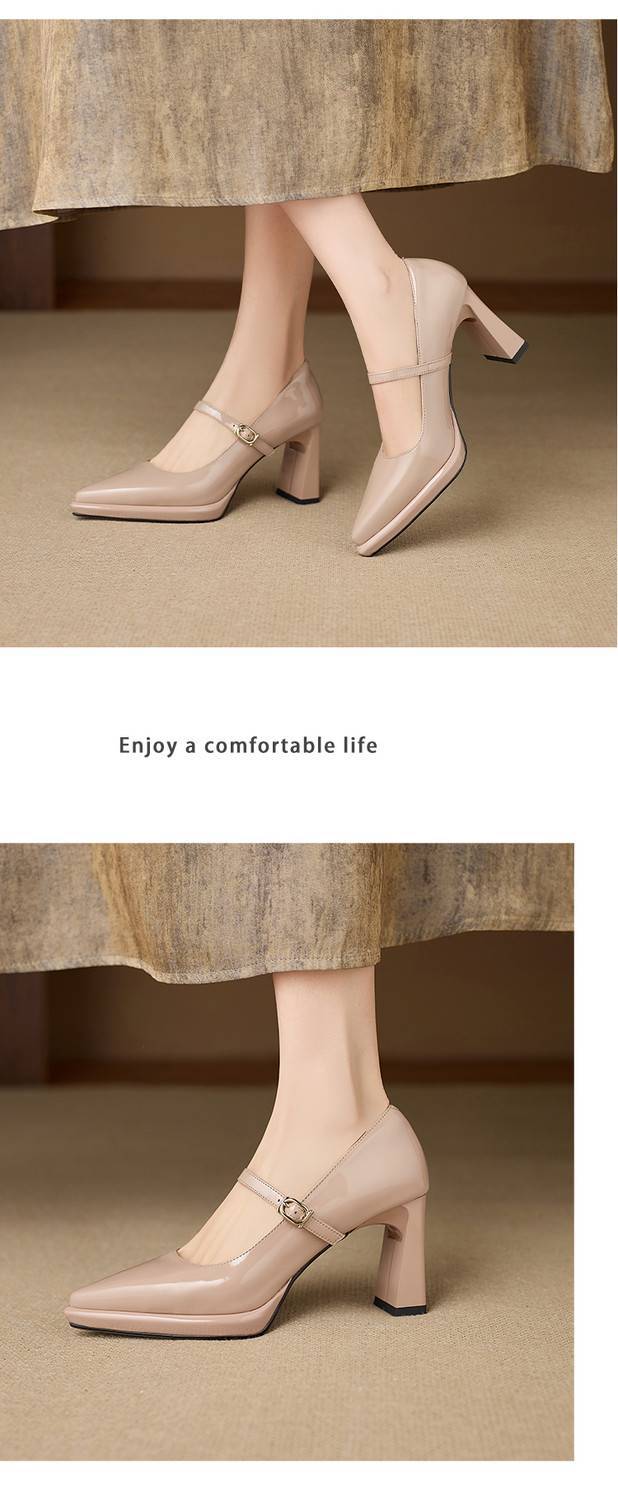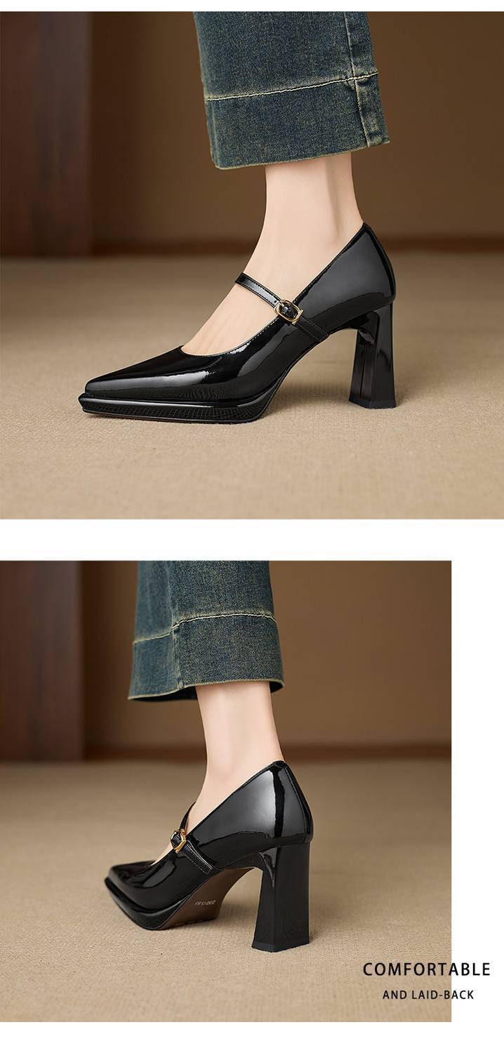 【预售5天】漆皮尖头粗跟单鞋女一字扣带高跟鞋防水台浅口职业鞋时尚款小皮鞋NWS1&N9879