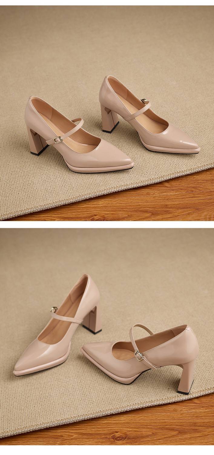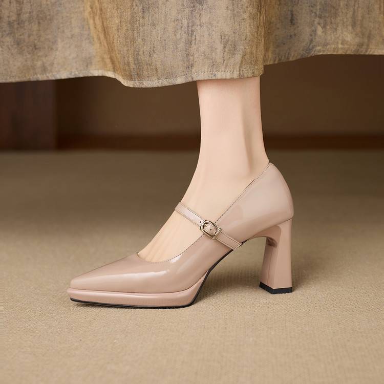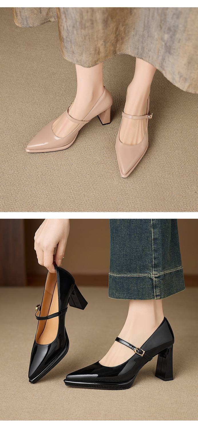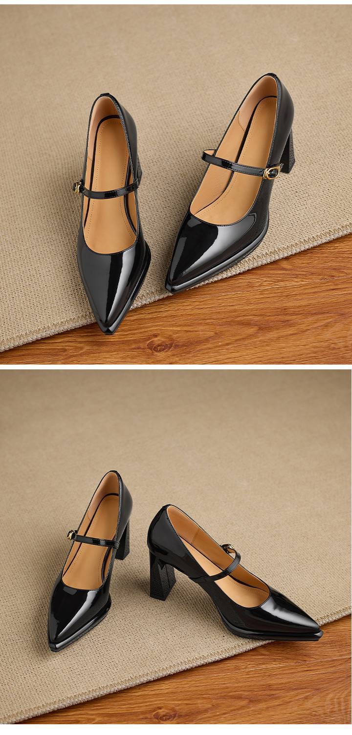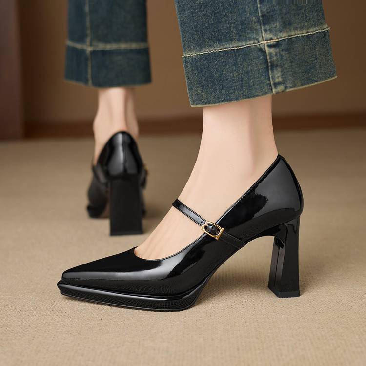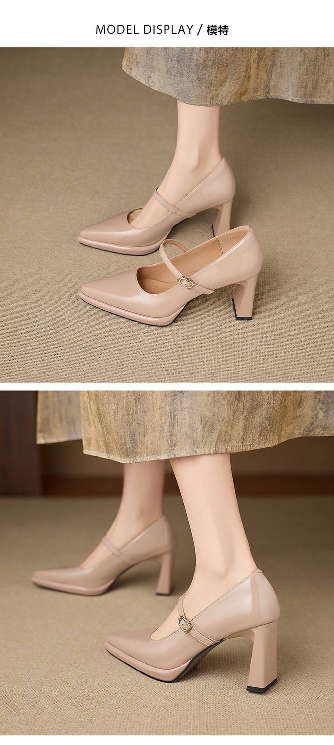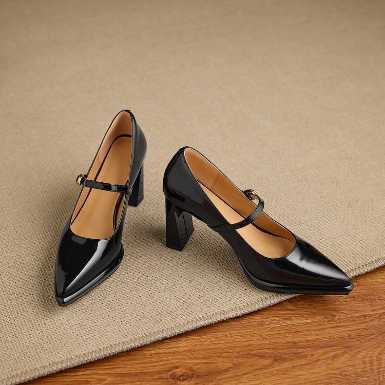【预售5天】漆皮尖头粗跟单鞋女一字扣带高跟鞋防水台浅口职业鞋时尚款小皮鞋NWS1&N9879