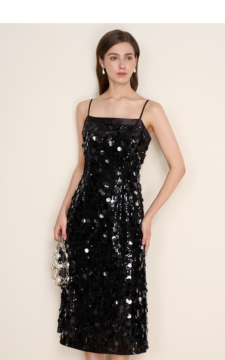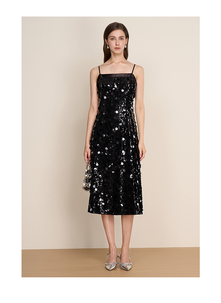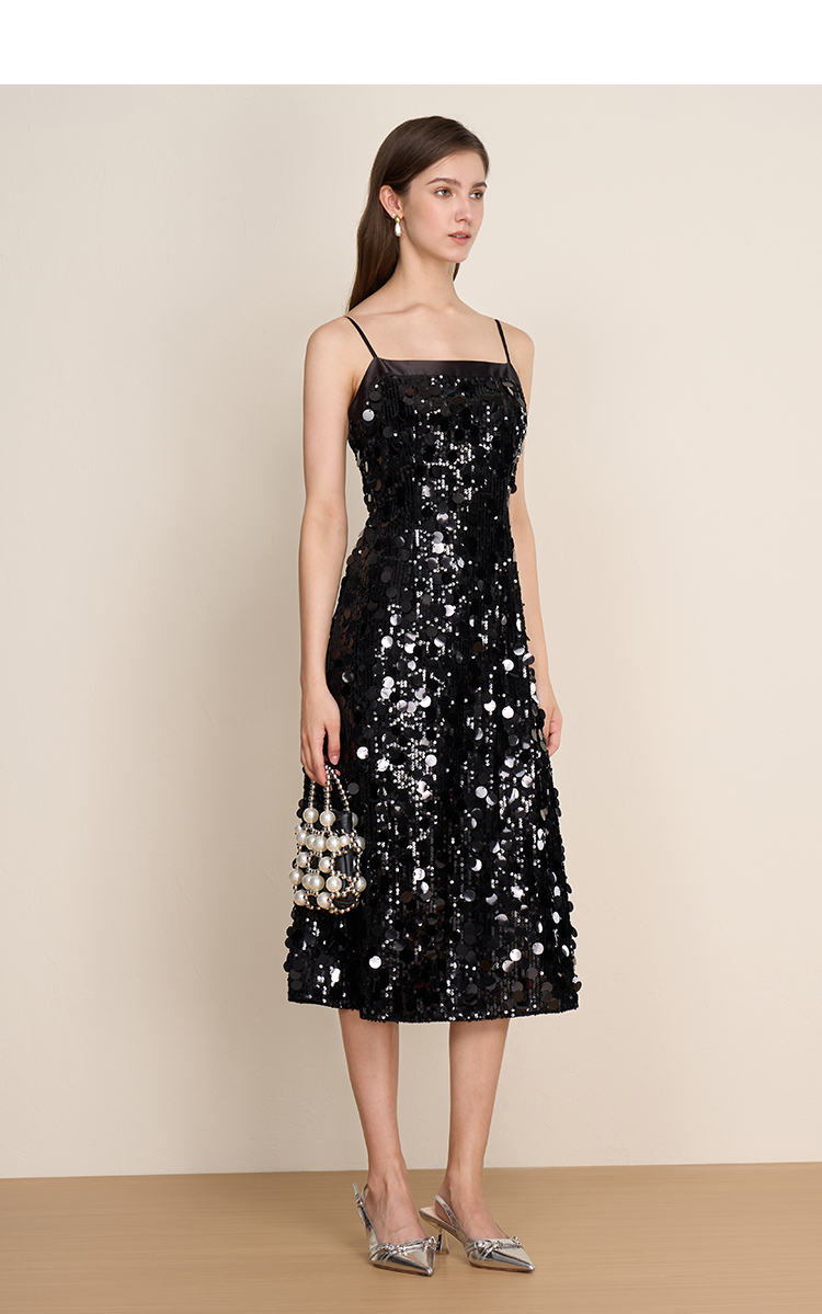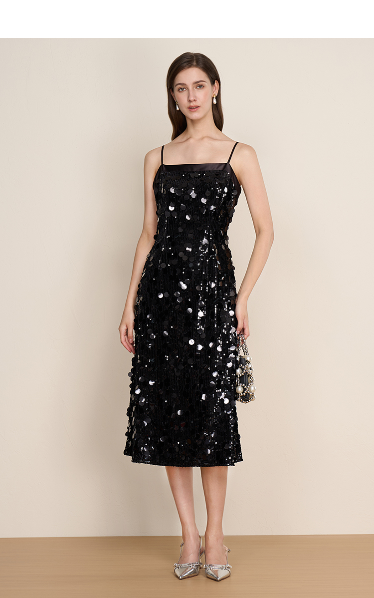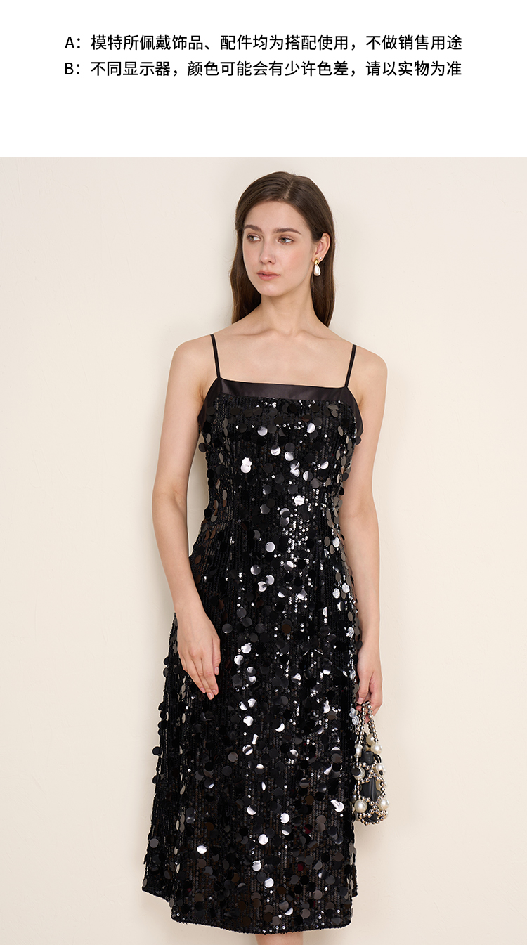 EITIE爱特爱冬季新款奢华感黑色亮片立体感收腰礼服连衣裙8007717