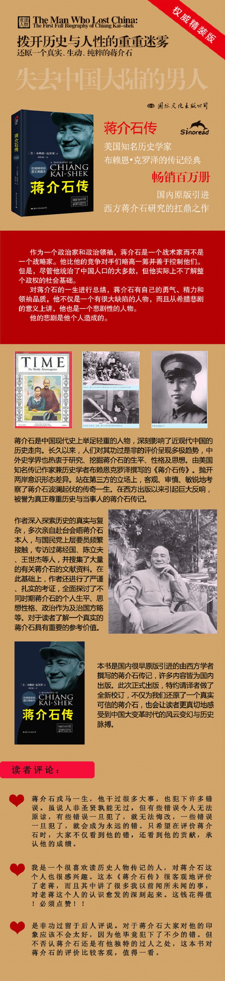 本书为西方的传记作家赖恩·克罗泽经典之作,被誉为第一部真正尊重历史与当事人的蒋介石传记,堪称当今世界经典的蒋介石传记版本,是西方蒋介石研究的高峰之作,以第三方的立场,“客观”、“犀利”、“敏锐”的观点,并配以大量披露的历史资料,全面、完整、深入地描绘了蒋介石波澜起伏、大是大非的一生。
