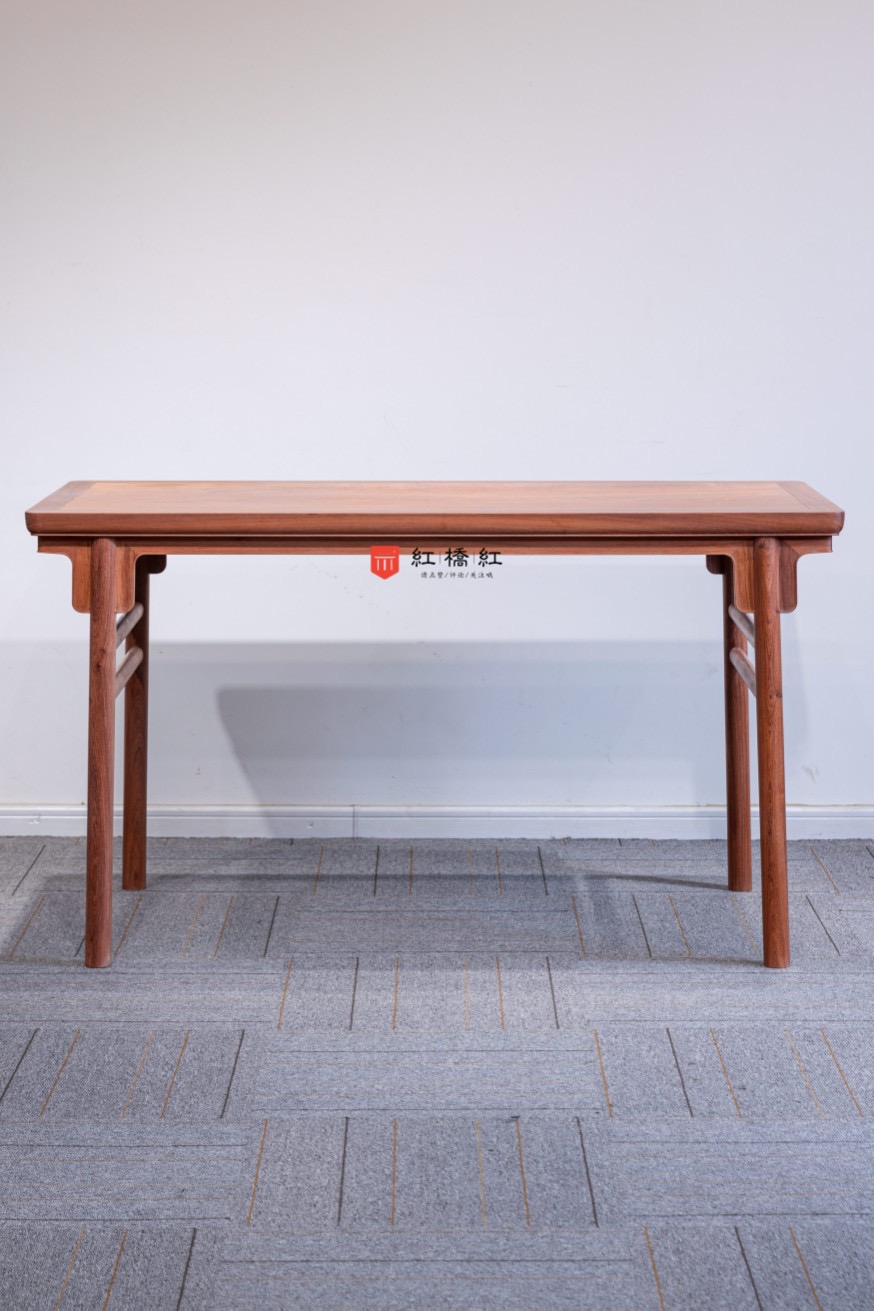 腿足间装椭圆形双支枨,可作为玄关、小课桌、小酒桌。