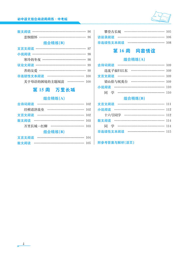 关联性的组合阅读训练是学生全面、快速提升阅读能力的利刃。本书紧扣考纲,力图通过组合阅读训练,打通平时训练与最终的考试评价,本书以“周周练”的形式出现,每周设置2次组合训练,涵盖了古诗词、文言文、现代文、非连续性文本阅读等形式,保证学生用最短的时间实现最高效的阅读!