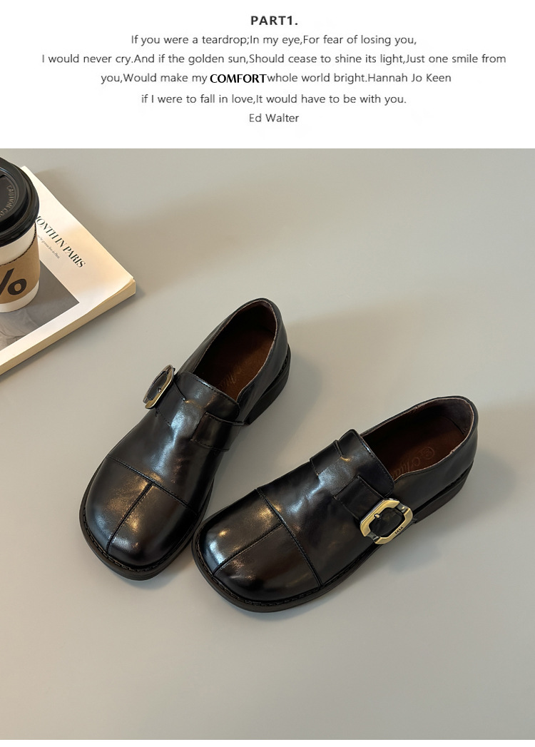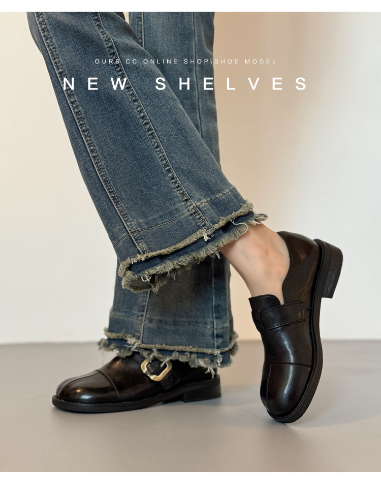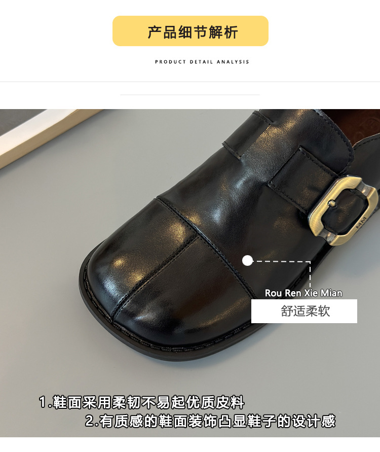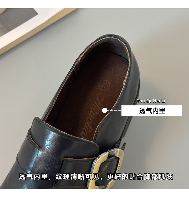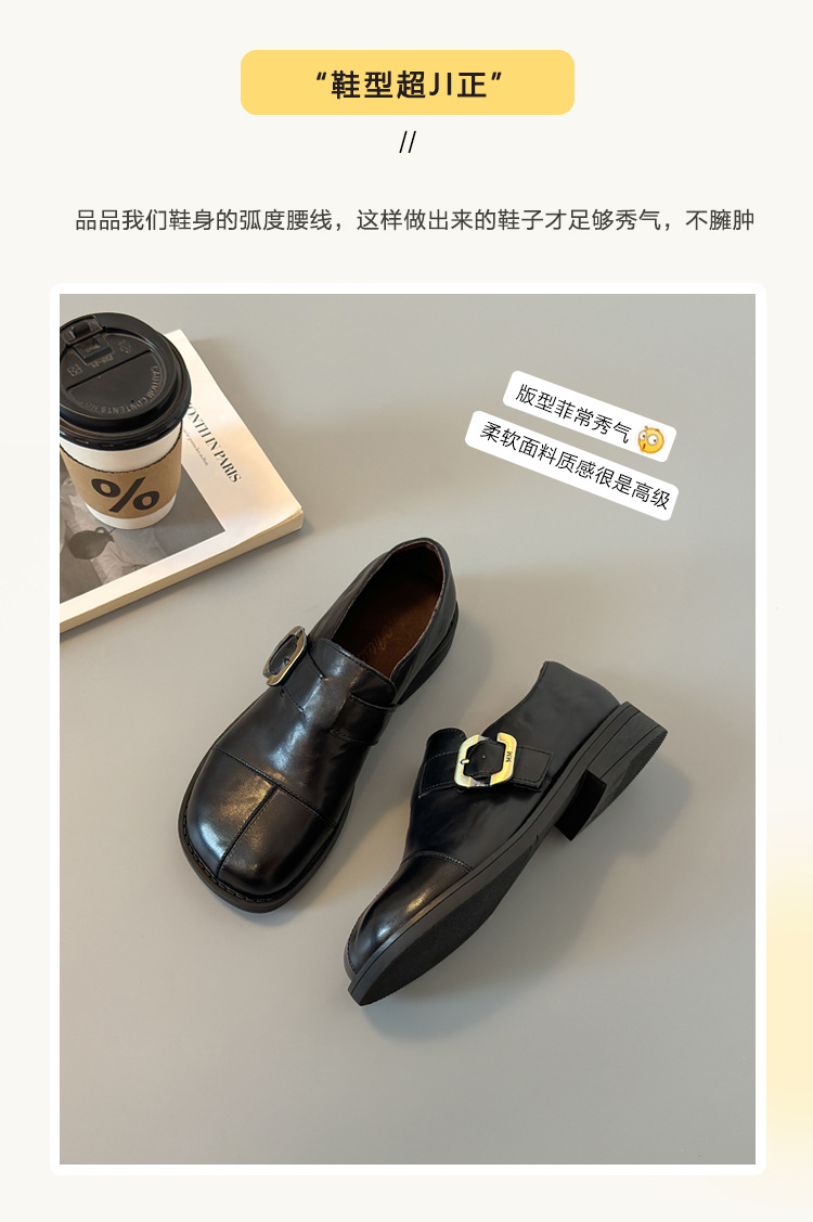 雀说大码皮带扣显瘦平底真皮乐福鞋女黑色百搭软底单鞋软皮圆头小皮鞋 WAL2-313