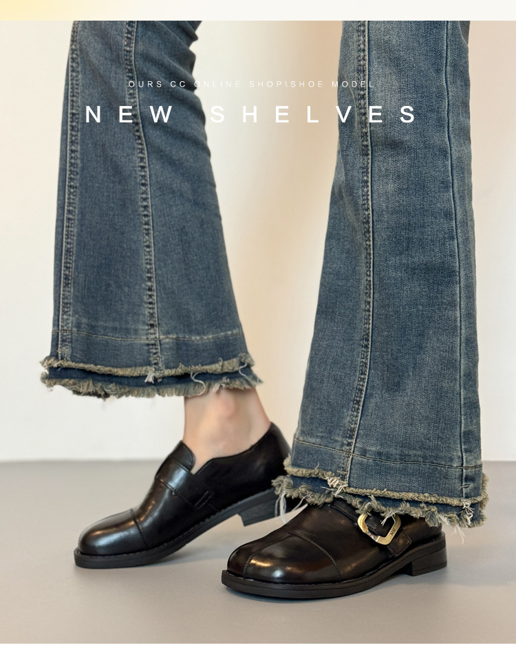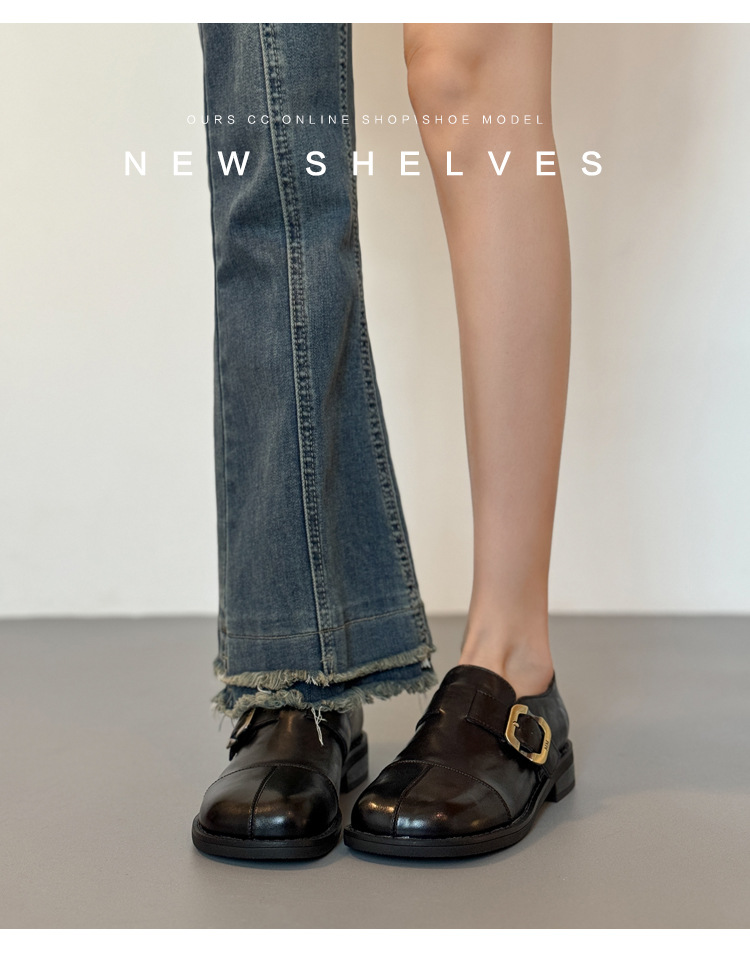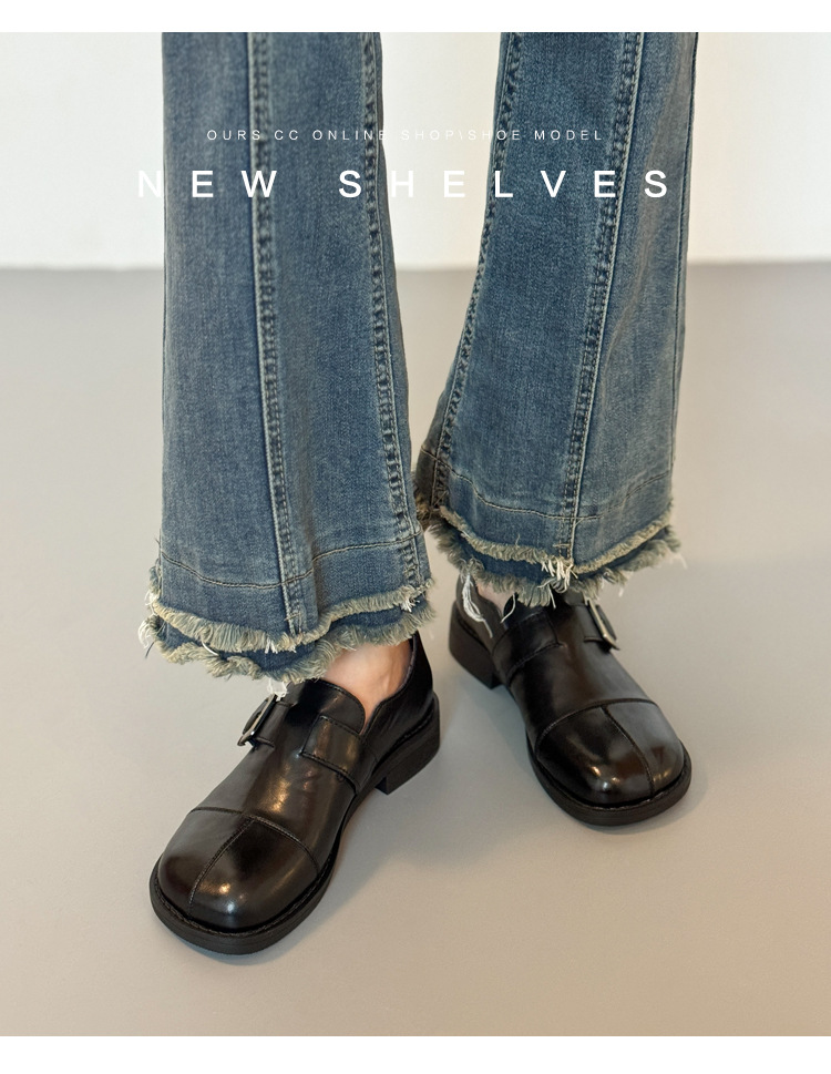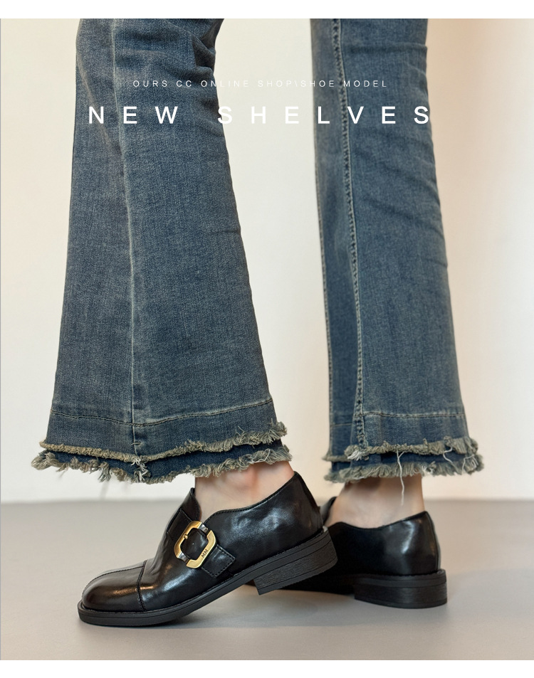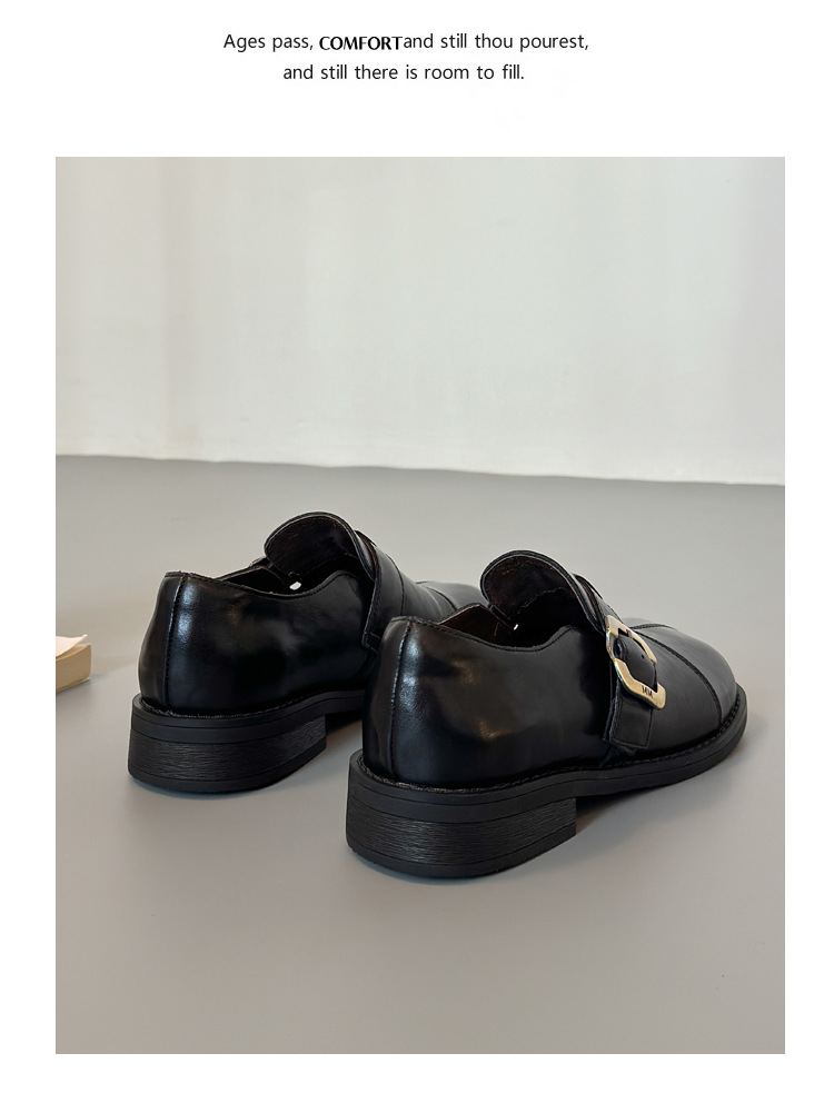 雀说大码皮带扣显瘦平底真皮乐福鞋女黑色百搭软底单鞋软皮圆头小皮鞋 WAL2-313