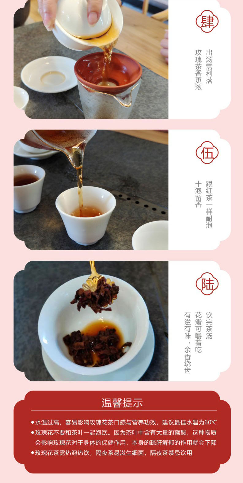 1、水温过高,容易影响玫瑰花茶口感与营养功效,建议最佳水温为60℃;