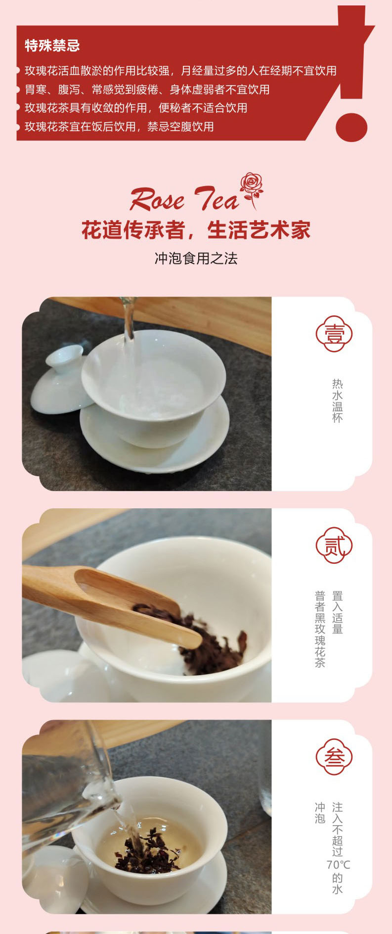 3、玫瑰花茶需热泡热饮,隔夜茶易滋生细菌,隔夜茶禁忌饮用。