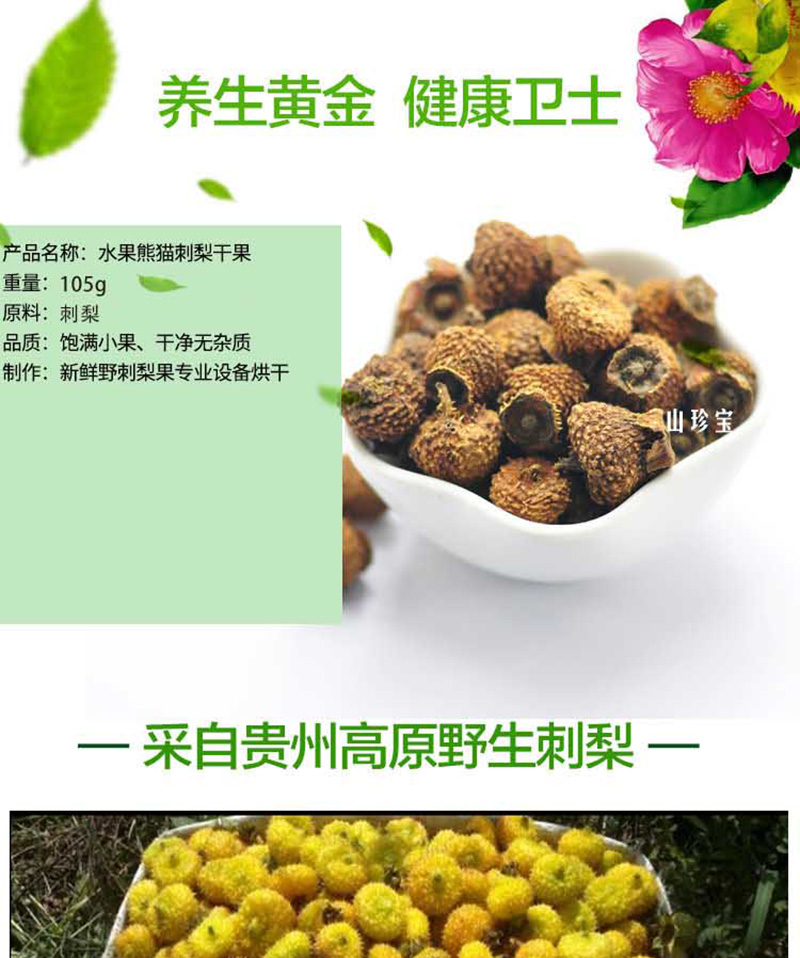 水果熊猫 有机刺梨干果 3包装*105g 高原精华·营养报表:精选云贵高原优质刺梨,维C含量是橙子的50倍!果肉厚实有嚼劲,酸酸甜甜唤醒味蕾!