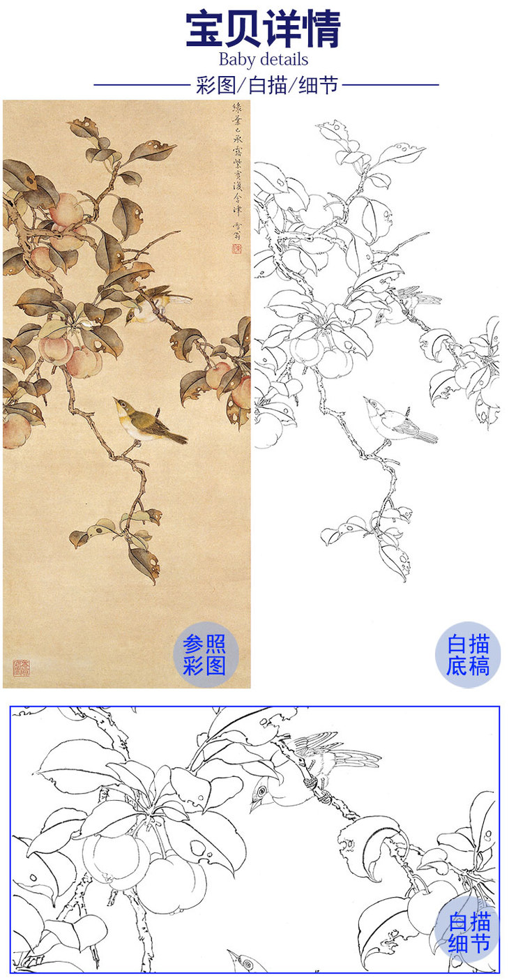 陈之佛竖幅工笔花鸟白描底稿《海棠绣眼》-多种白描尺寸可选-QA68