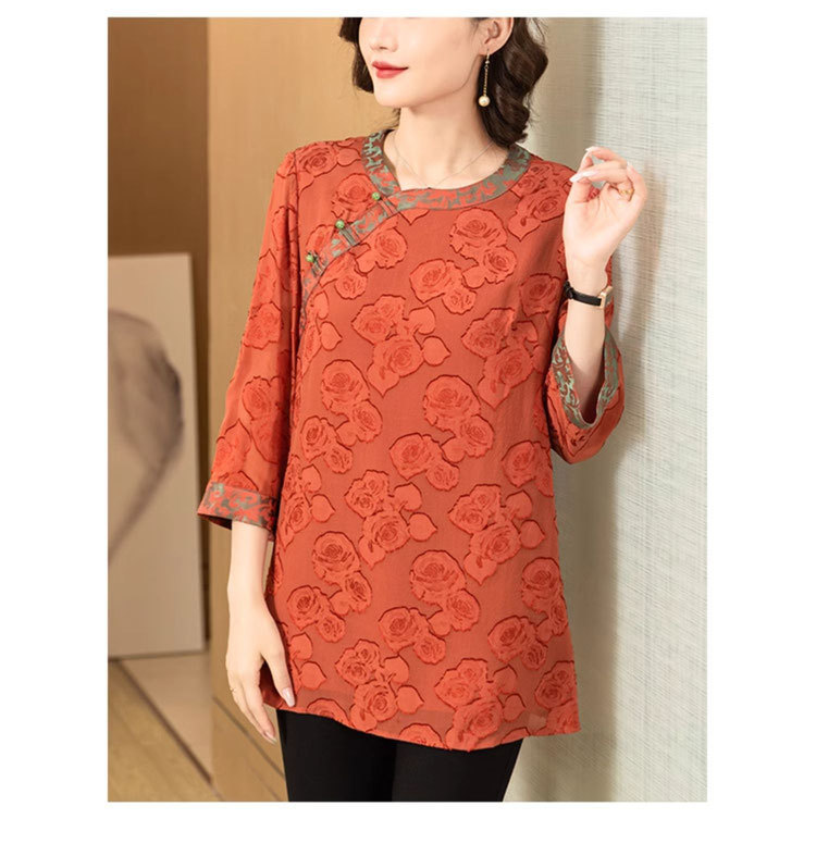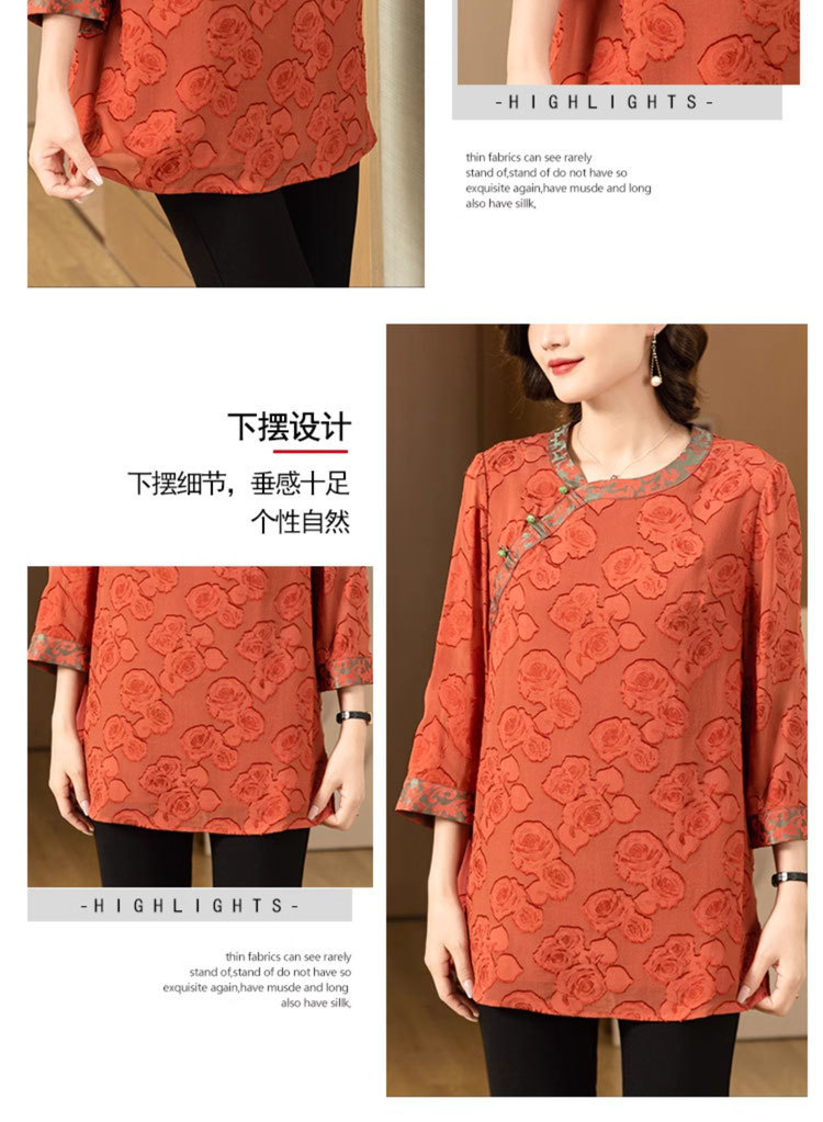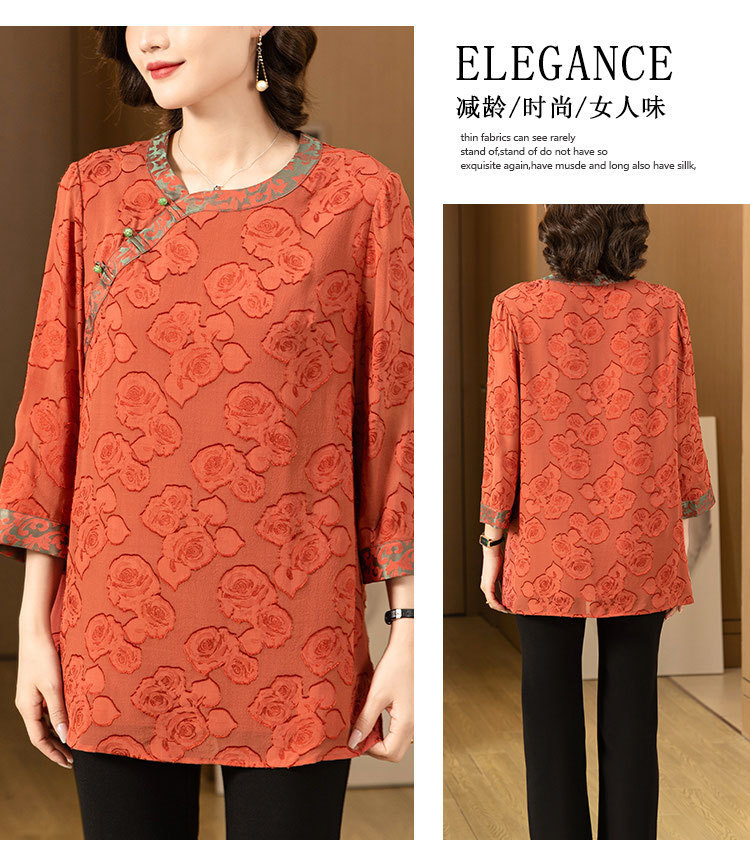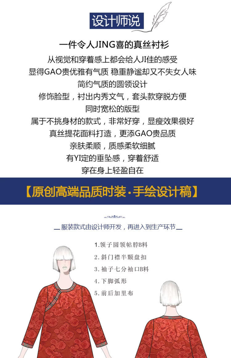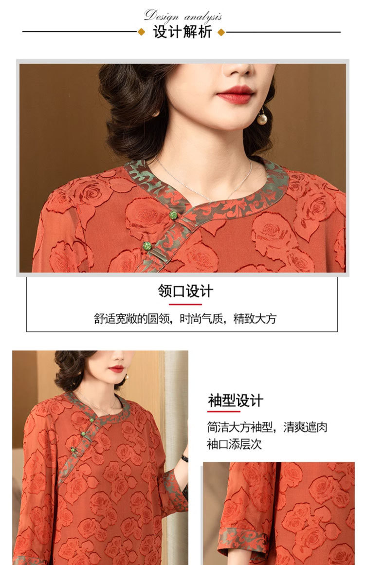宽松丝上衣女春夏新款时尚剪花拼接圆领复古洋气妈妈中长款衬衣