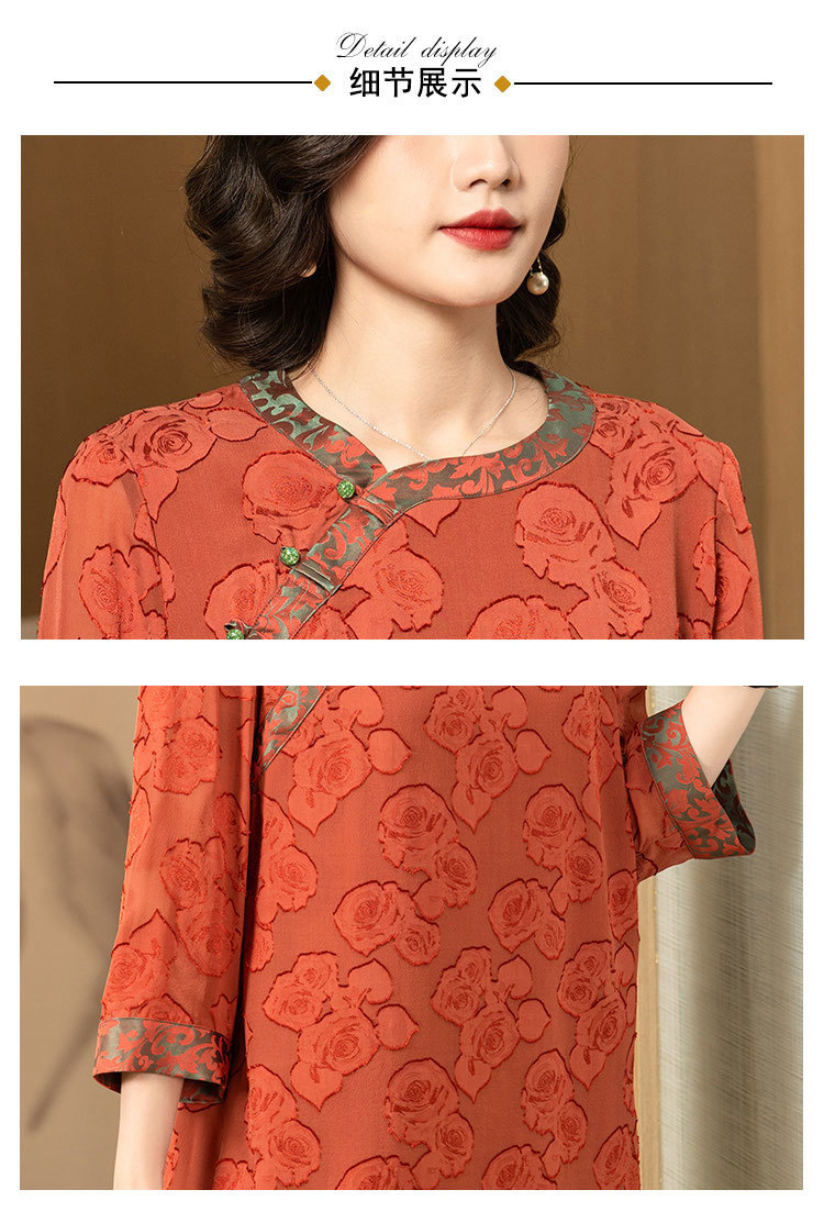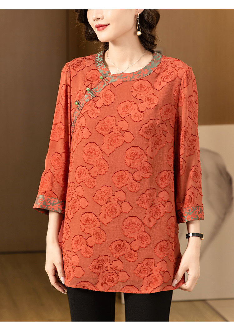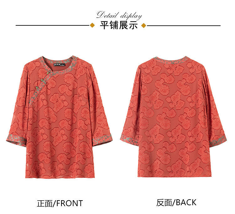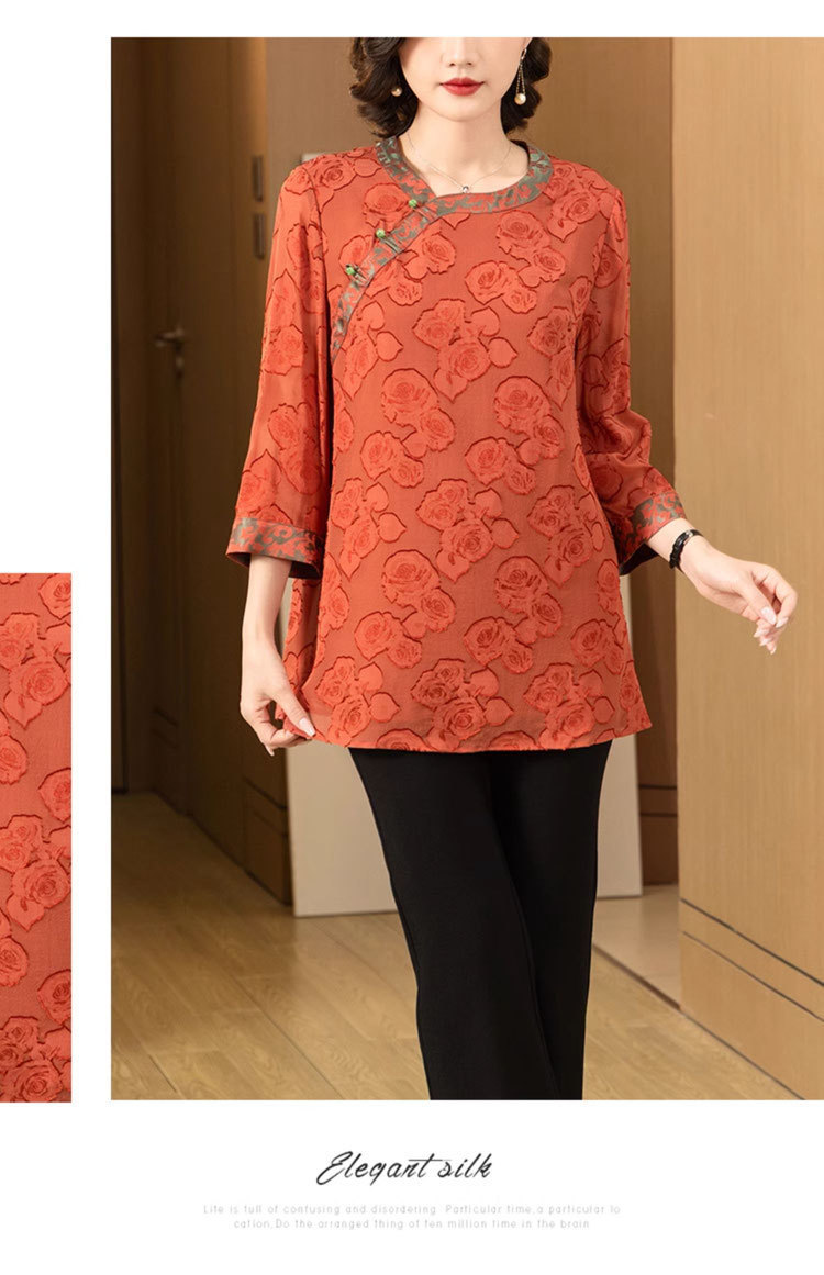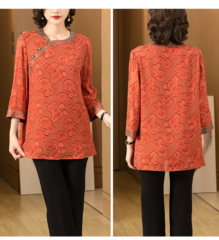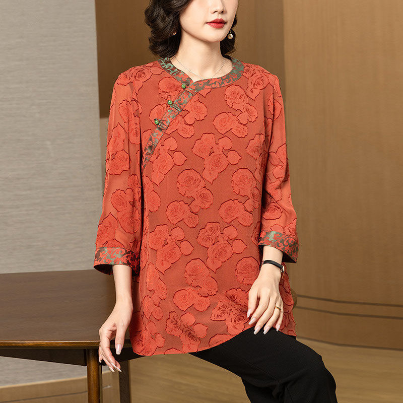 宽松丝上衣女春夏新款时尚剪花拼接圆领复古洋气妈妈中长款衬衣